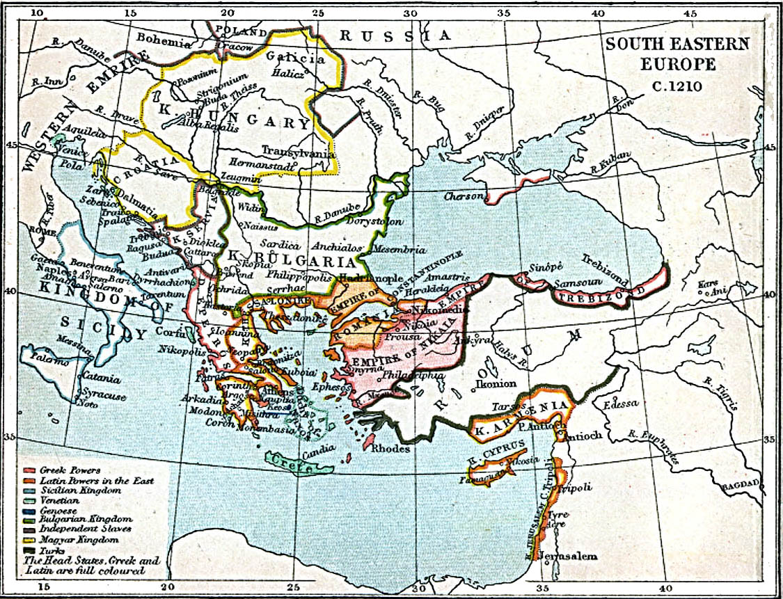 South Eastern Europe Map 1210 A.D. Historical Europe Atlas to Freemans Historical Geography, Edited by J.B. Bury, Longmans Green and Co. Third Edition 1903