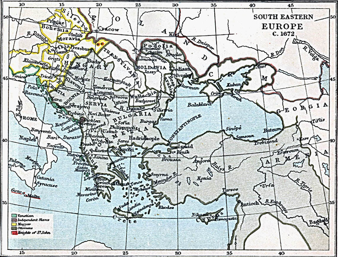 South Eastern Europe Map 1672 A.D. Historical Europe Atlas to Freemans Historical Geography, Edited by J.B. Bury, Longmans Green and Co. Third Edition 1903