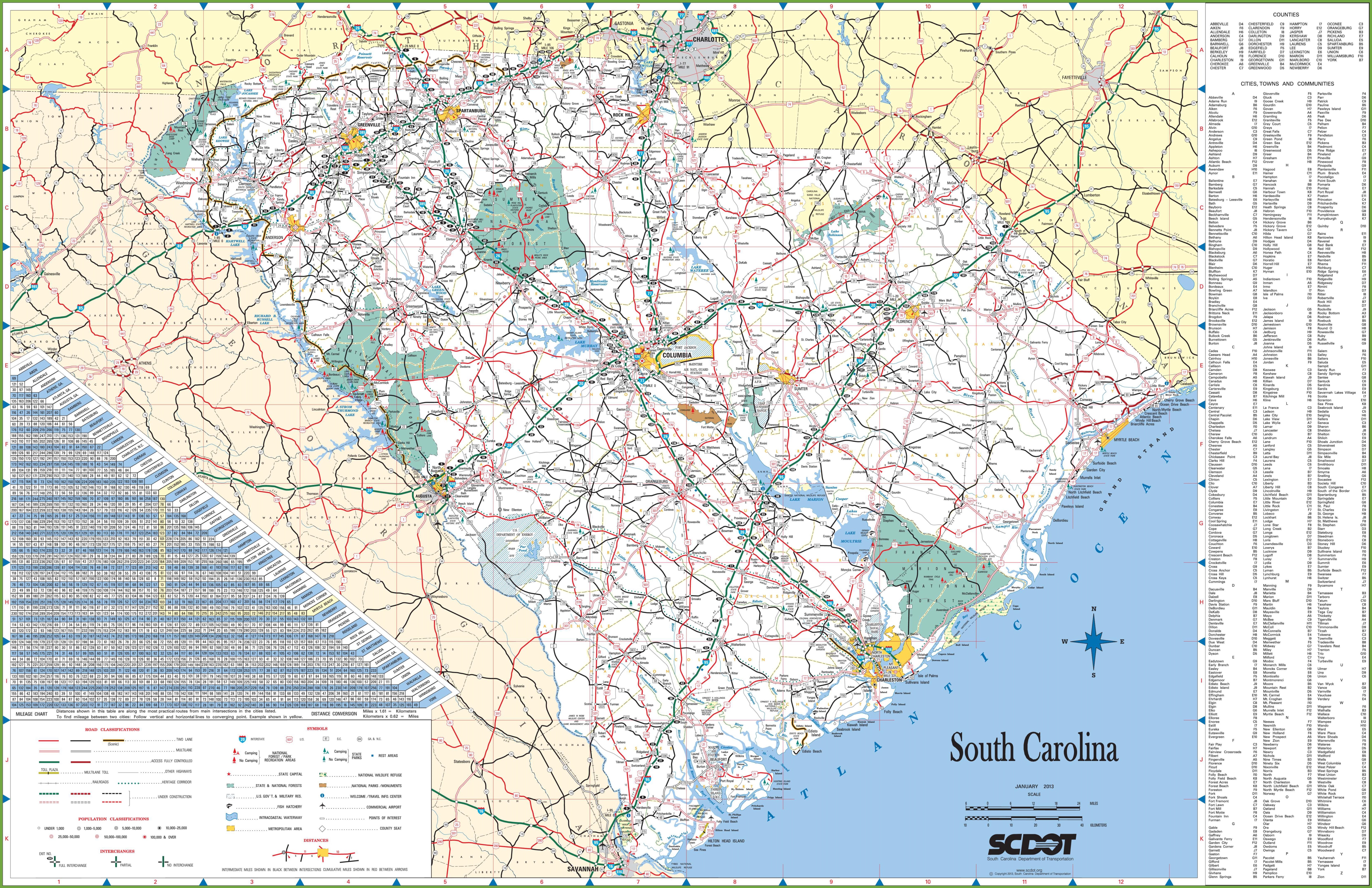Map of South Carolina, United States Road South Carolina South Carolina Department of Transportation The State of South Carolina, populated by 5,024,369 inhabitants (2017) is subdivided into 46 counties, and extends over 82,931 km², for a population density of 60.6 inhabitants / km². Its capital is Columbia.