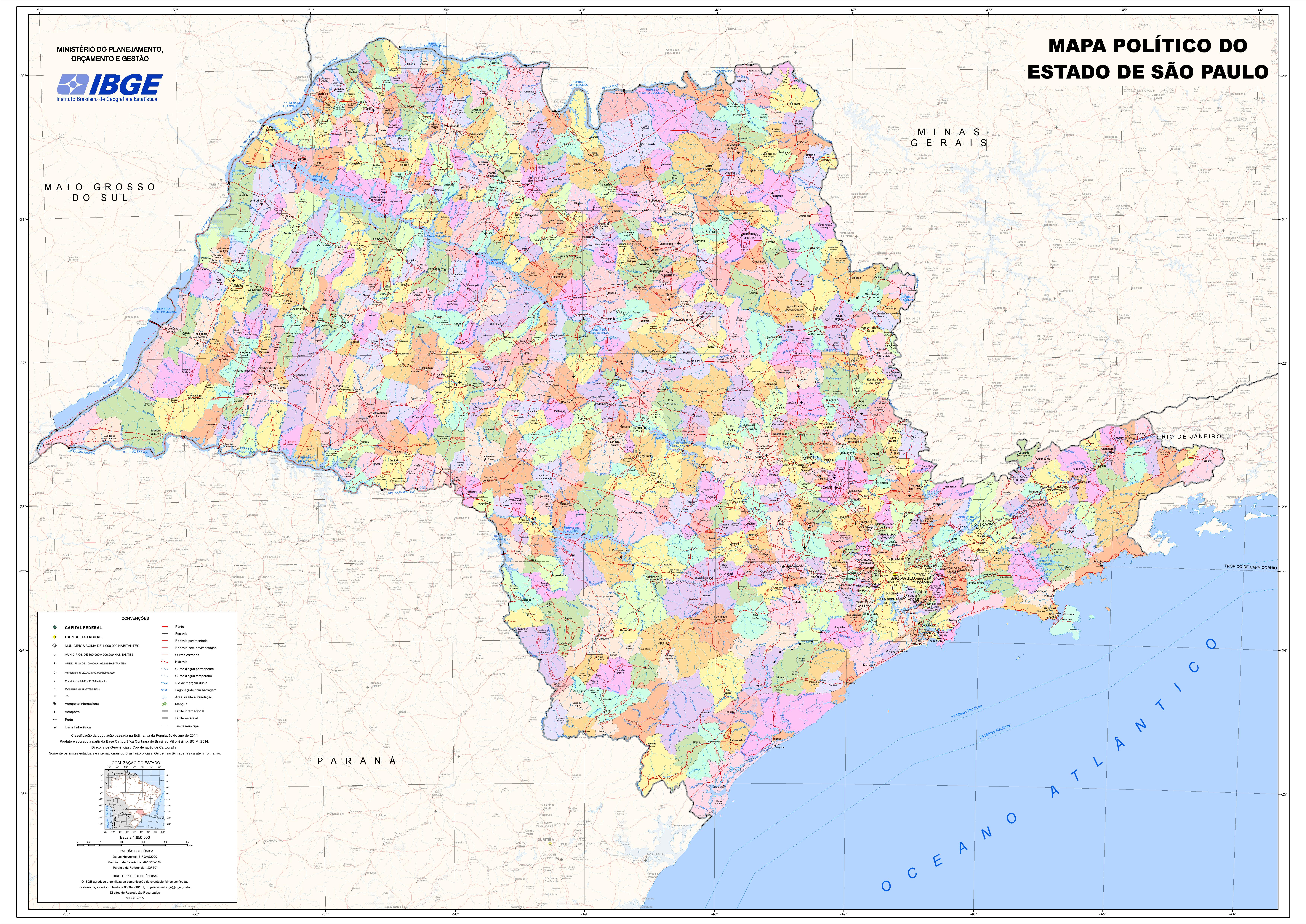 Political map of the State of São Paulo showing the municipal, state and international borders, the hydrographic characteristics, the main roads and capitals of the 645 municipalities of the state.