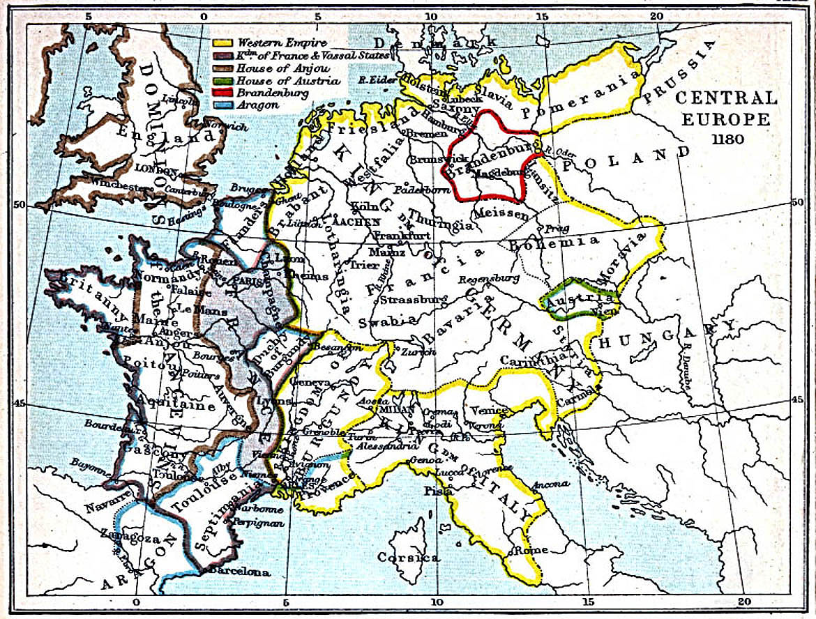 Europa Central 1180 A.D. Histórico Europa "Atlas to Freemans Historical Geography", editado por J.B. Bury, Longmans Green and Co. Tercera edición 1903 Europa Central 1180 A.D.