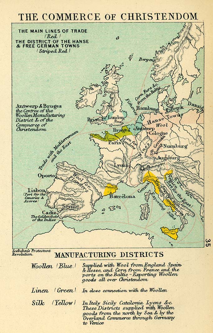 Comercio en la Cristiandad en el siglo XVI Histórico Europa The Public Schools Historical Atlas by Charles Colbeck. Longmans, Green; New York; London; Bombay. 1905 Mapa de la página 35