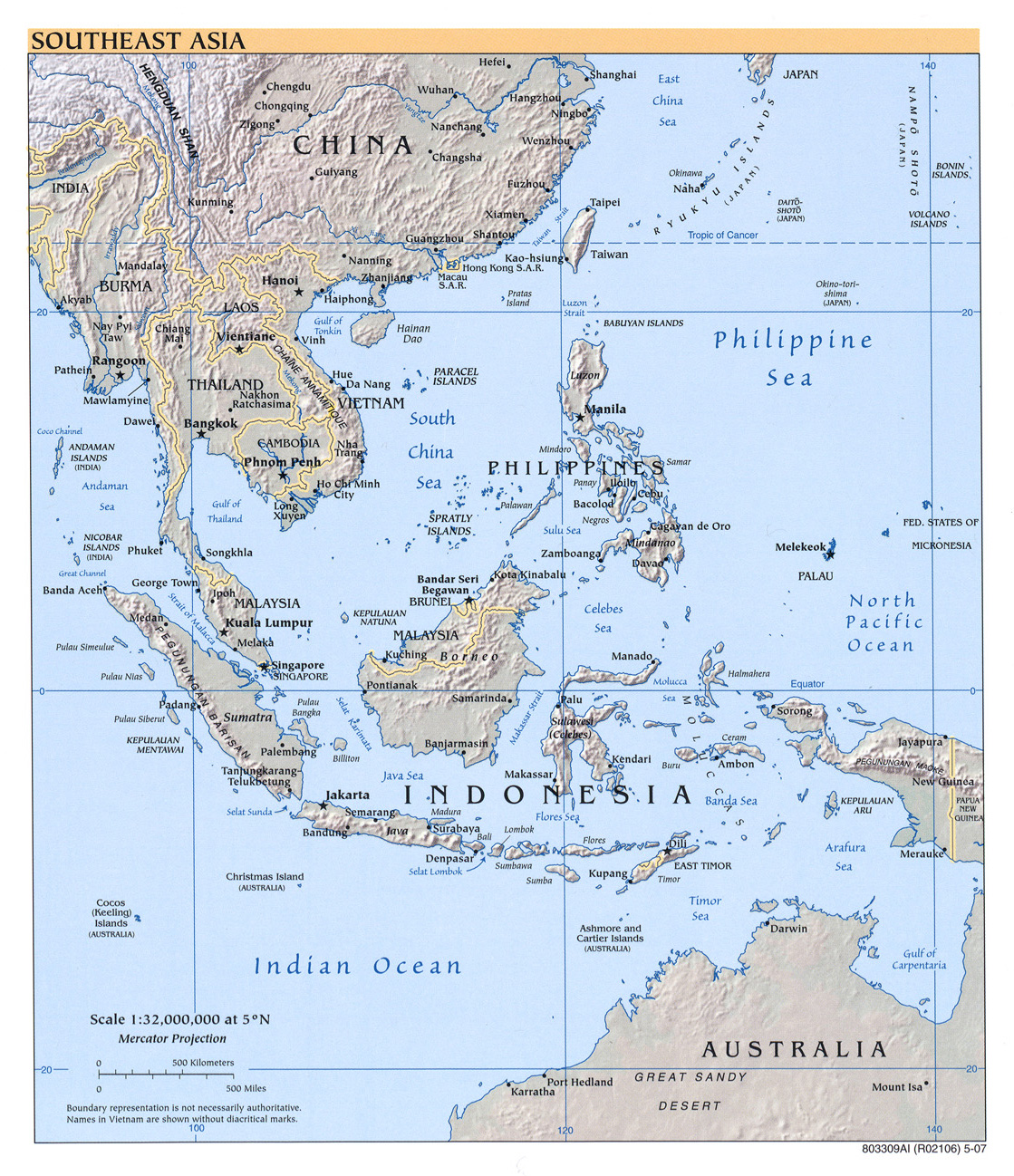 Mapa Físico del Sudeste Asiático Físico Asia Agencia Central de Inteligencia (en inglés, Central Intelligence Agency: CIA) Mapa Físico del Sudeste Asiático. Mapa 2007.