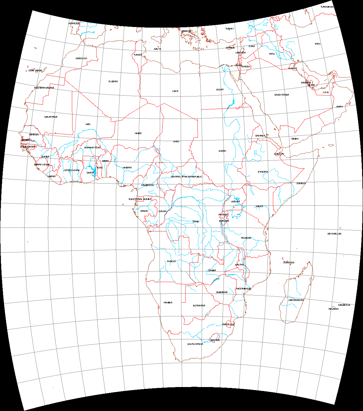 El mapa muestra todo África y Madagascar con una distorsión de menos de 5%.