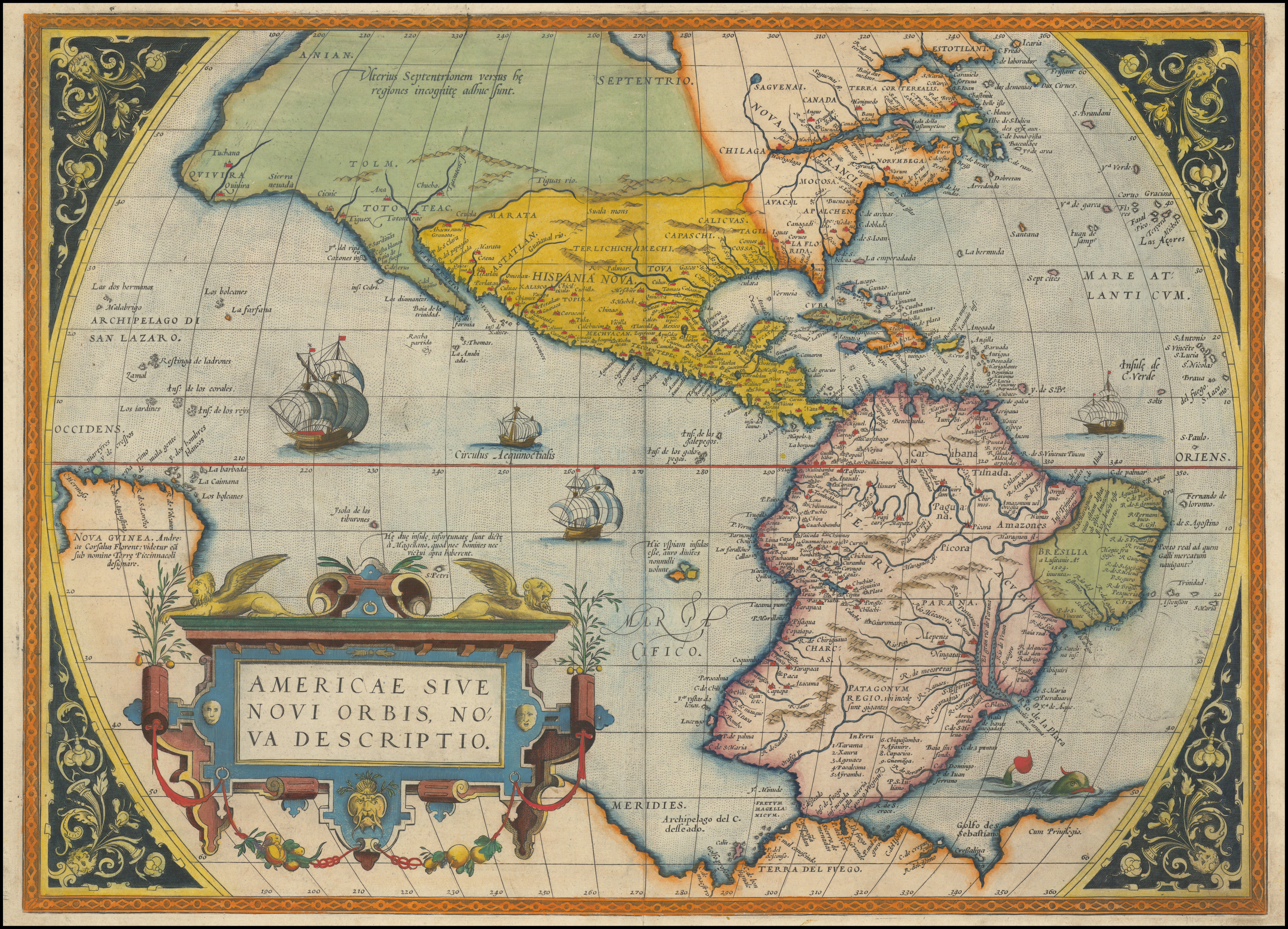 Este es el mapa del hemisferio occidental de Abraham Ortelius, considerado el «primer mapa de las Américas en aparecer en un atlas moderno» (Schwartz). El éxito de Ortelius y la difusión de su atlas hicieron de este magnífico mapa la representación estándar, y la mejor, de las Américas durante el período inicial de su colonización.