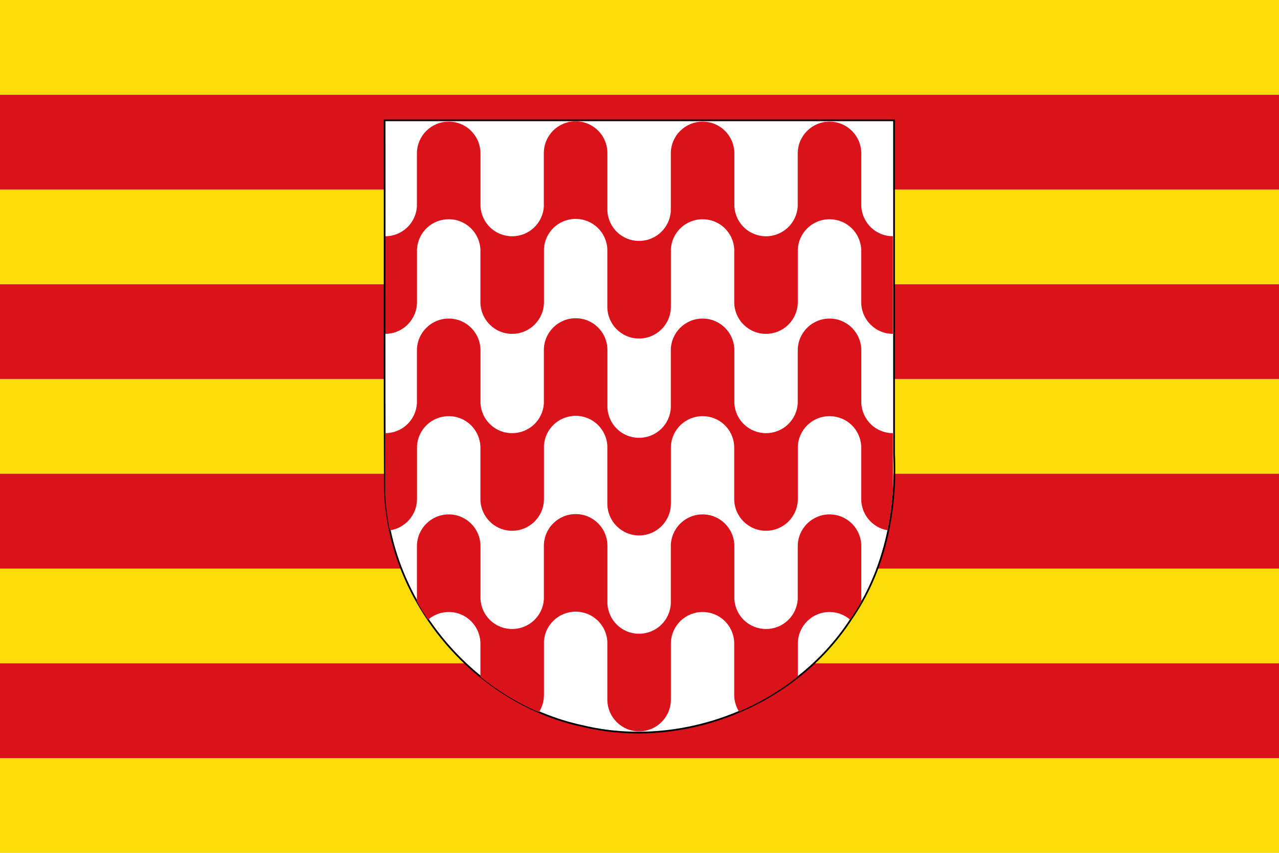 Bandera de Gerona, Gerona, España. Bandera apaisada, de proporciones dos de alto por tres de largo, dividida en nueve fajas iguales, cinco amarillas y cuatro rojas alternadas, con el escusón cuadrilongo ibérico verado de ondas blancas y rojas del escudo en el centro, de altura 18/25 de la del paño y largura 2/5 de la del mismo paño.