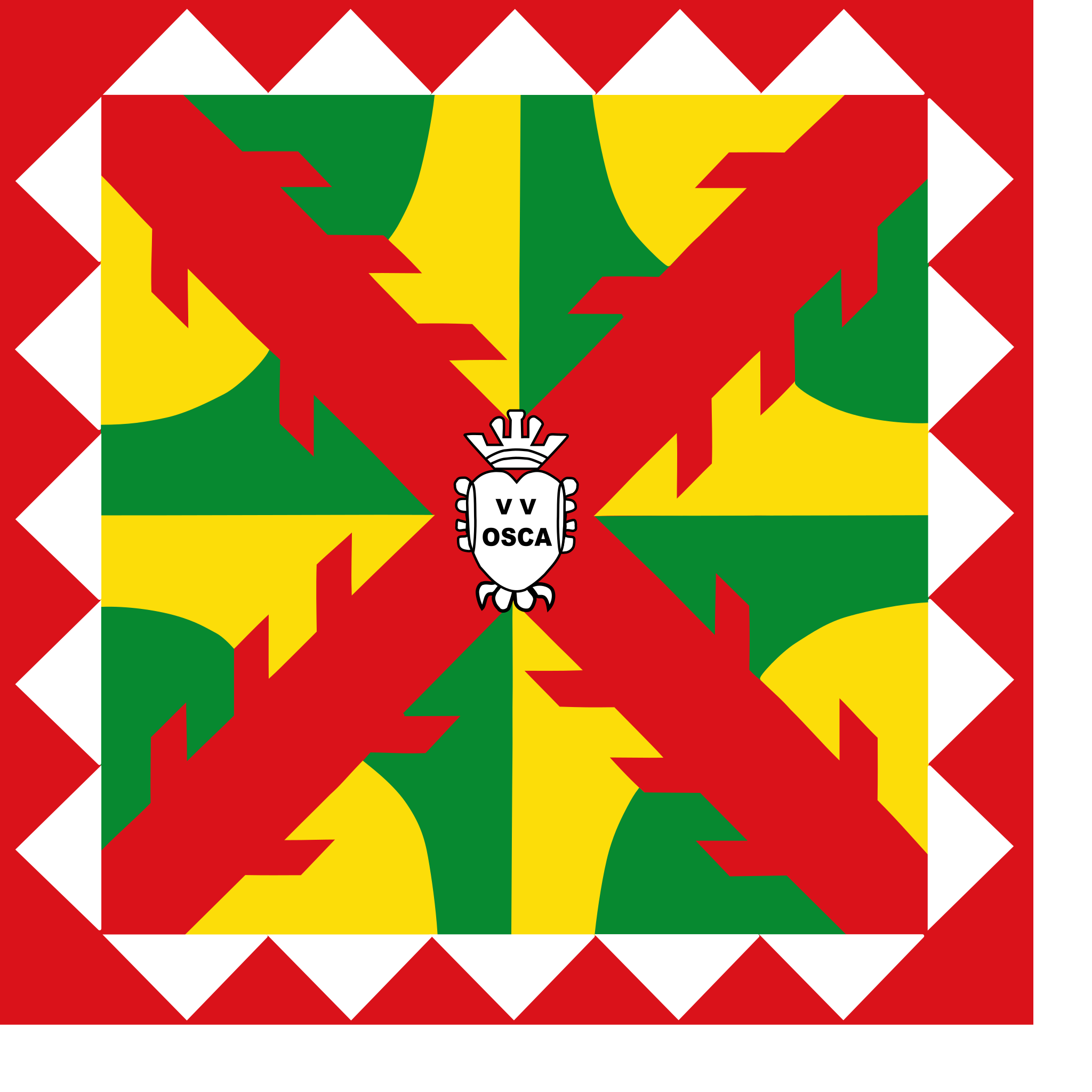 La bandera de Huesca se compone de la Cruz de Borgoña y de complejos motivos de carácter geométrico en colores blanco, rojo, amarillo y verde. En el centro de la bandera hay un pequeño escudo con el lema romano VV Osca (vrbs victrix osca-Ciudad Vencedora Huesca).