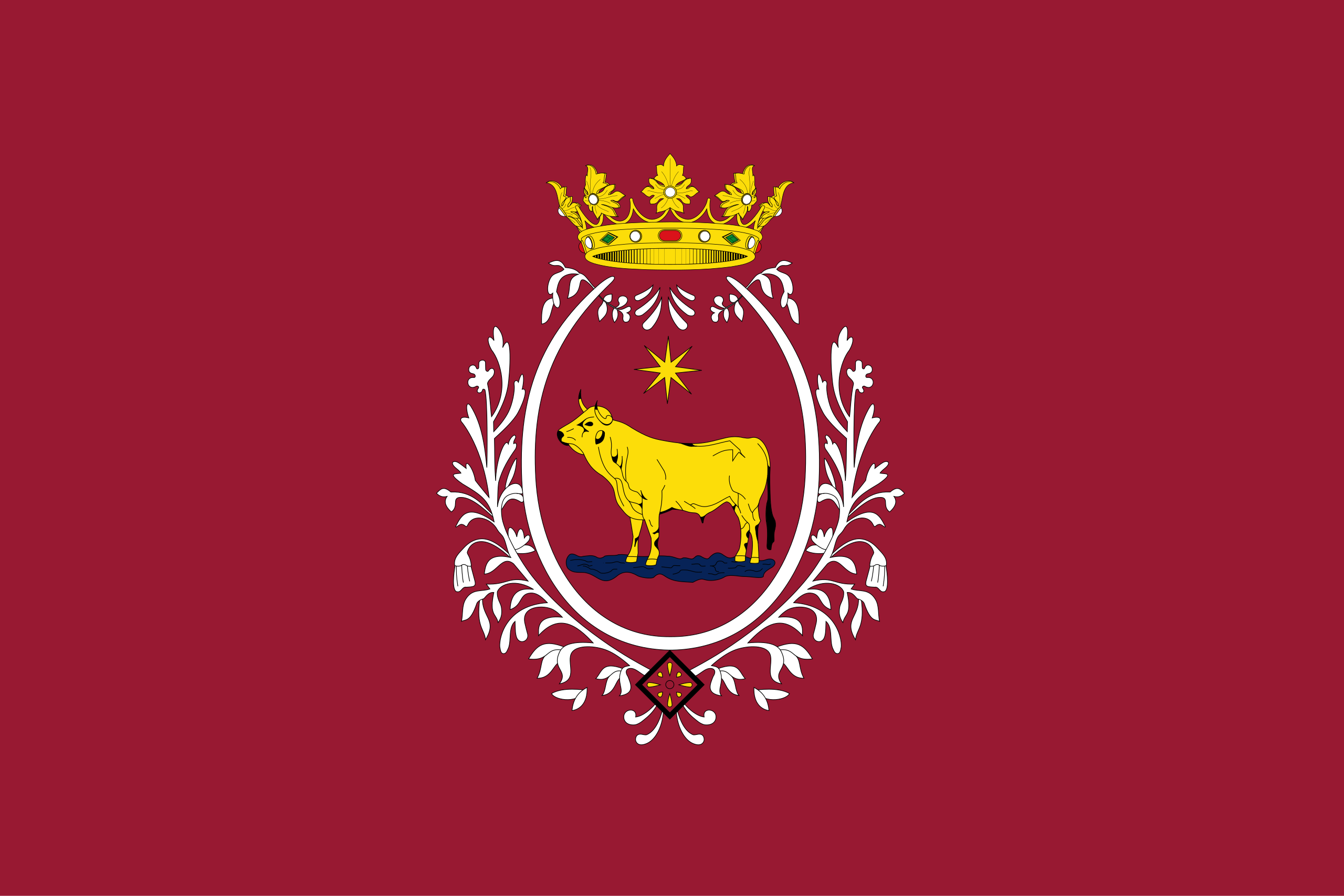 Bandera de la ciudad de Teruel (Aragón). Paño rojo carmesí, con las armas primitivas (toro amarillo surmontado de estrella de seis puntas en campo carmesí como el paño), si bien dentro de un círculo rodeado de lauréola y timbrado de corona ducal.