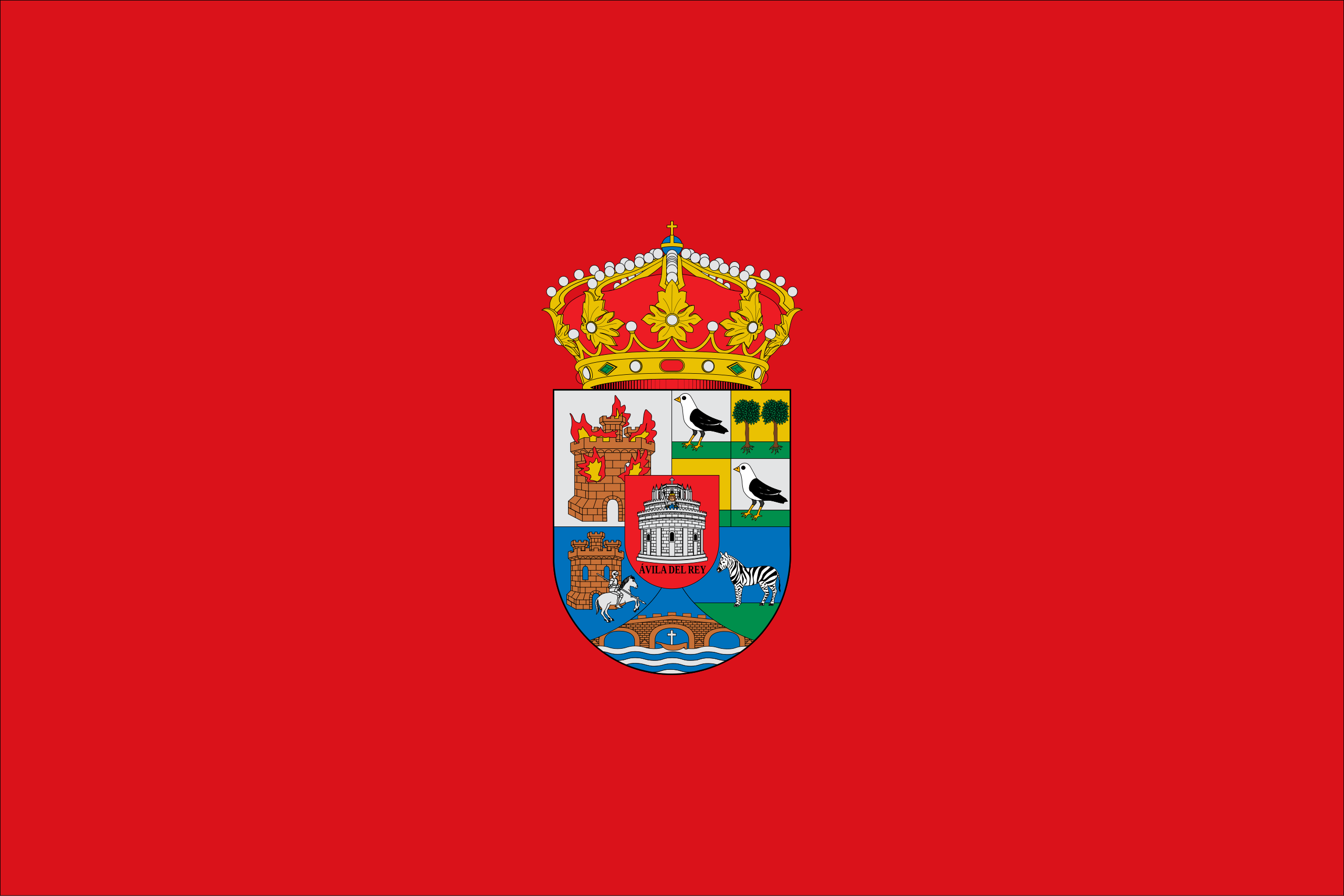 La bandera oficial de la provincia de Ávila, en Castilla y León, España, presenta un fondo rojo con el escudo provincial en el centro. Este escudo está dividido en cinco cuarteles que representan diferentes municipios y comarcas de la provincia, coronado por una corona real. El fondo rojo simboliza la herencia castellana de la región.
