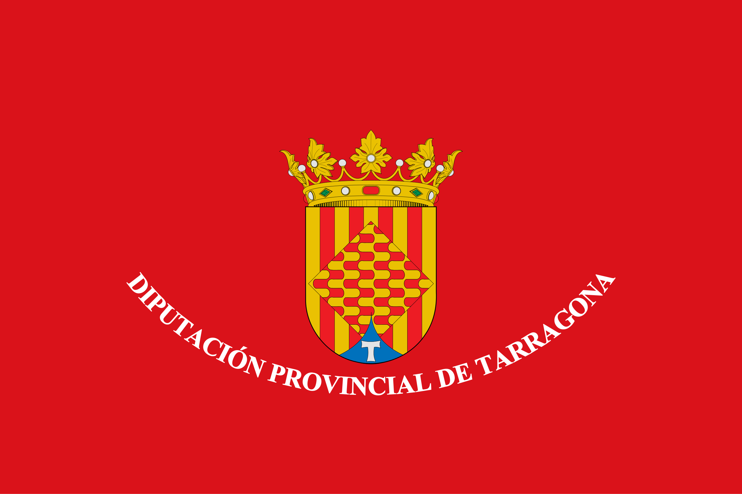 Bandera desde al menos 1975 de la provincia de Tarragona (Cataluña, España): de rojo, el escudo provincial en el centro y debajo el texto «Diputación provincial de Tarragona».