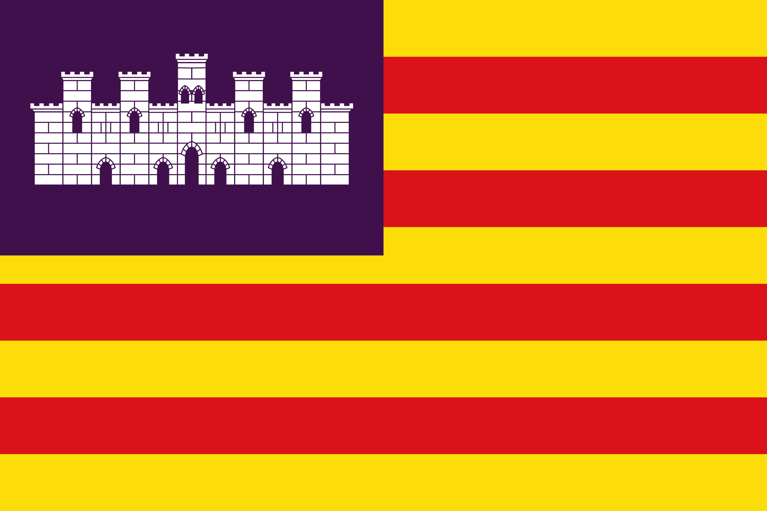 La bandera de las Islas Baleares, integrada por símbolos distintivos legitimados históricamente, está constituida por cuatro barras rojas horizontales sobre fondo amarillo, con un cuartel situado en la parte superior izquierda de fondo morado y con un castillo blanco de cinco torres en medio.