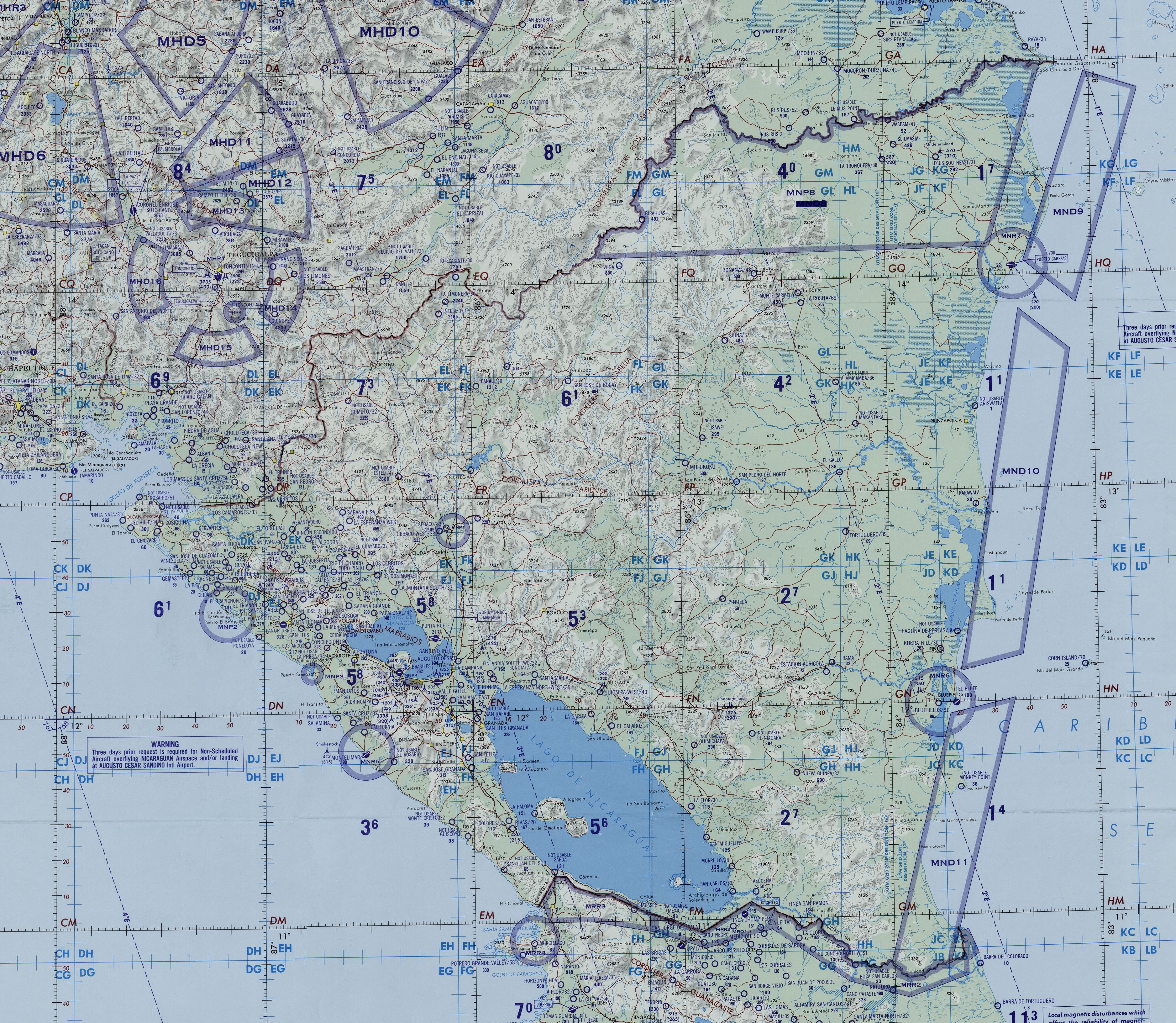 Extracto de la Carta de Navegación Operativa (CNO) K-25 centrada en Nicaragua (formato PDF), la hoja K-25 es carta aeronáutica a escala 1:1 000 000 producida por la Defense Mapping Agency (DMA) en 1989, a través de su Centro Aeroespacial. Fue ampliamente utilizada por la aviación militar y civil durante la Guerra Fría.