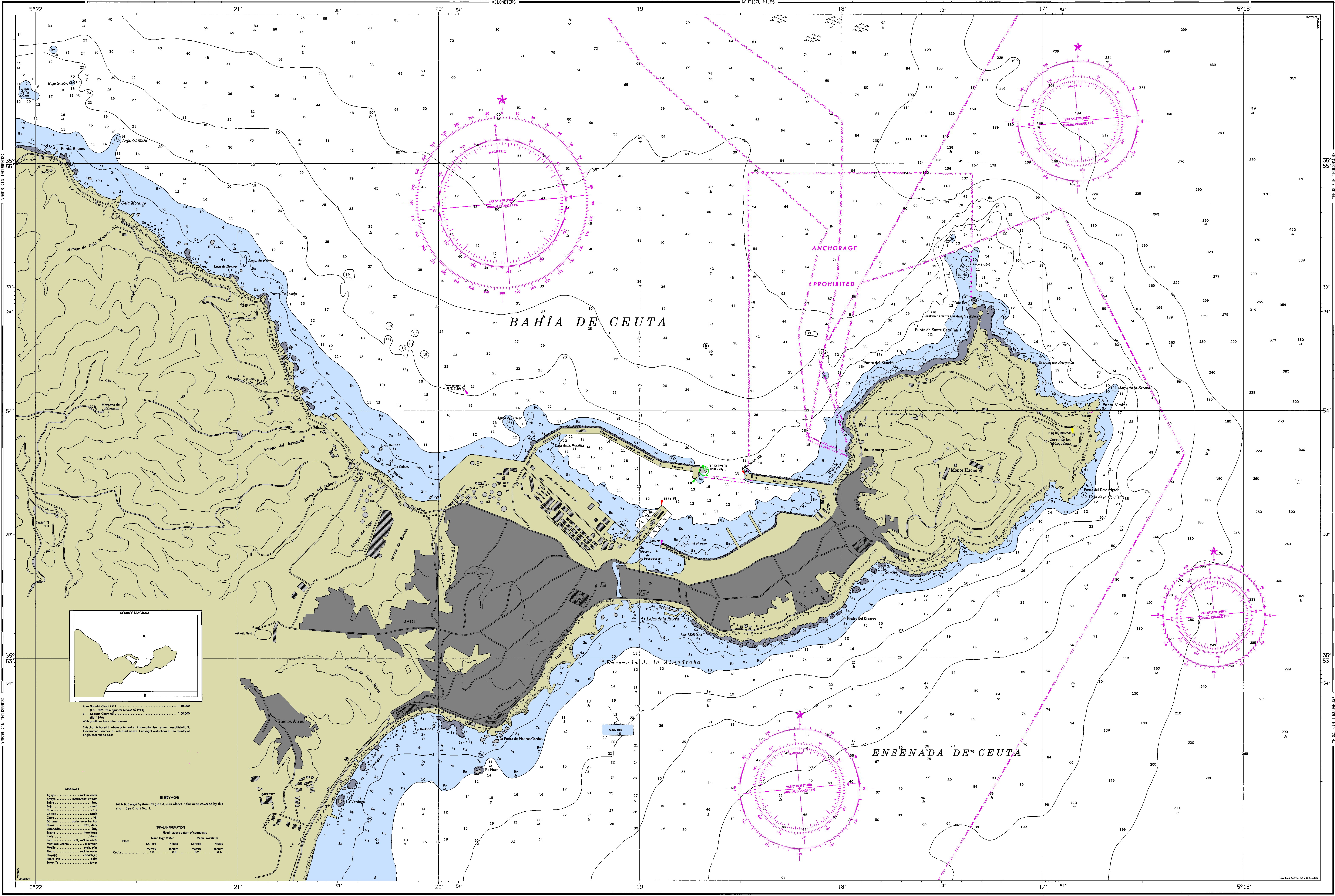 Carta náutica (formato PDF) con representación a escala de las aguas navegables y regiones terrestres adjuntas de la Bahía de Ceuta, indica las profundidades del agua y las alturas del terreno, naturaleza del fondo, detalles de la costa incluyendo puertos, peligros a la navegación, localización de luces y otras ayudas a la navegación. Carta náutica no para ser utilizada para la navegación.