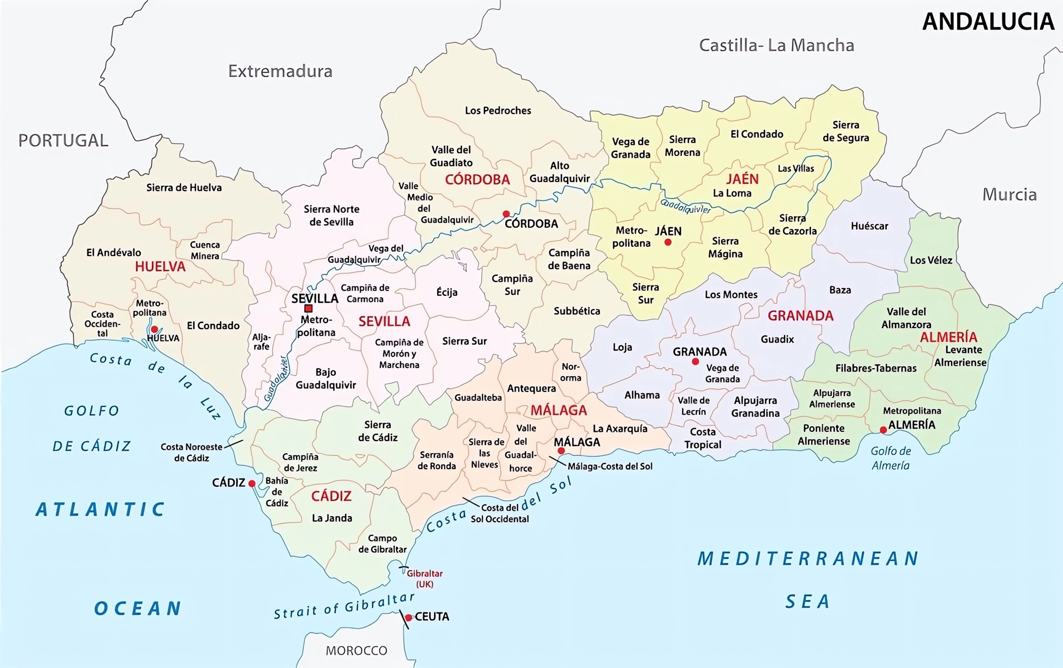 | Campo de Gibraltar | 8 | 1528,6 | 271988 | 177,93 | Algeciras | Cádiz |