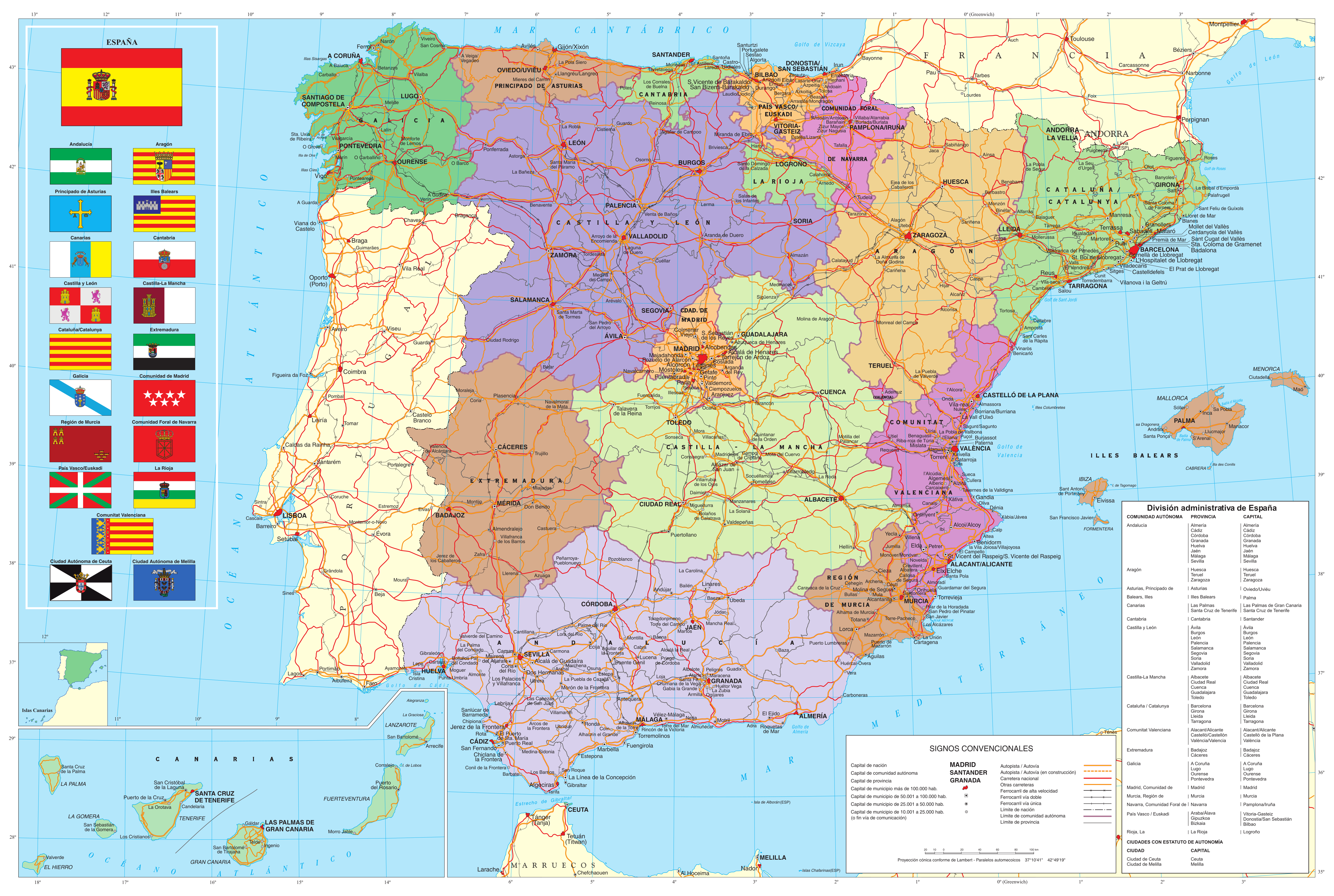 Mapa de España que muestra las principales ciudades (formato PDF), así como partes de los países circundantes, el mar Mediterráneo y el golfo de Vizcaya.