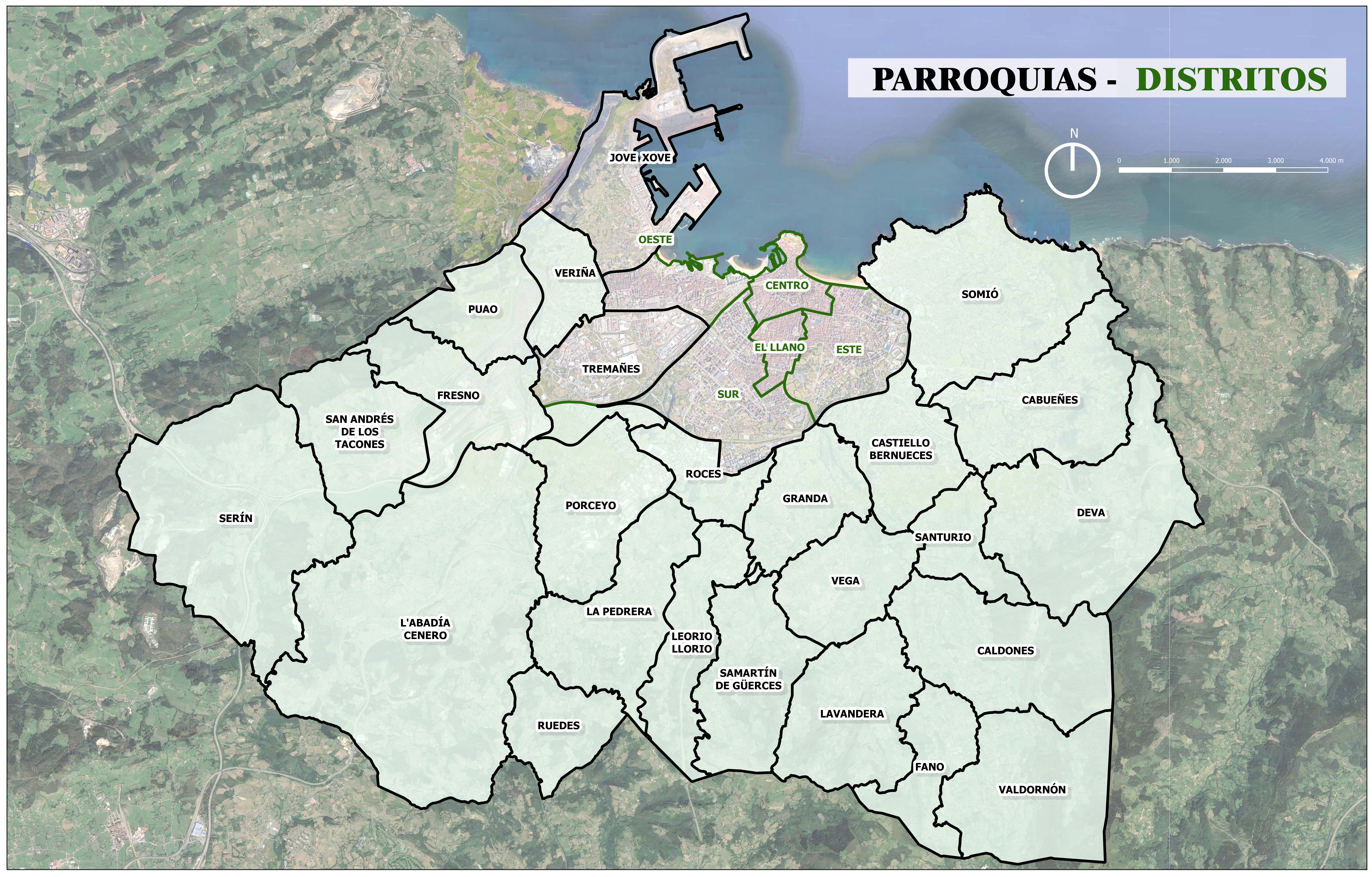 | Rural | Baldornón, Bernueces, Cabueñes, Caldones, Cenero, Deva, Fano, Fresno, Granda, Huerces, La Pedrera, Lavandera, Leorio, Poago, Porceyo, Ruedes, Santurio, Serín, Somió, Tacones, Vega y Veriña |