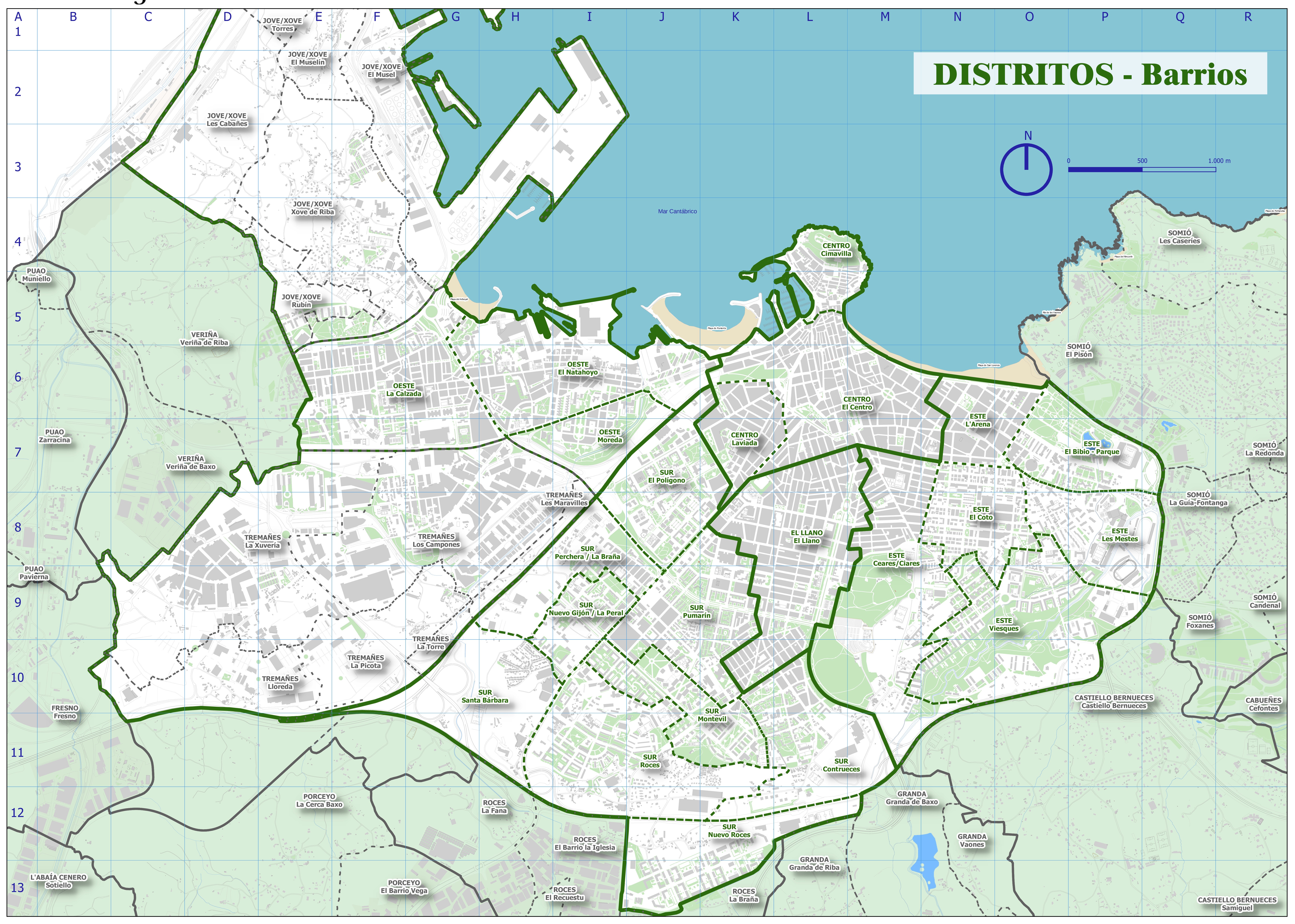 | Sur | Pumarín, Montevil, Contrueces, El Polígono, Perchera-La Braña, Nuevo Gijón, Santa Bárbara, Roces y Nuevo Roces |