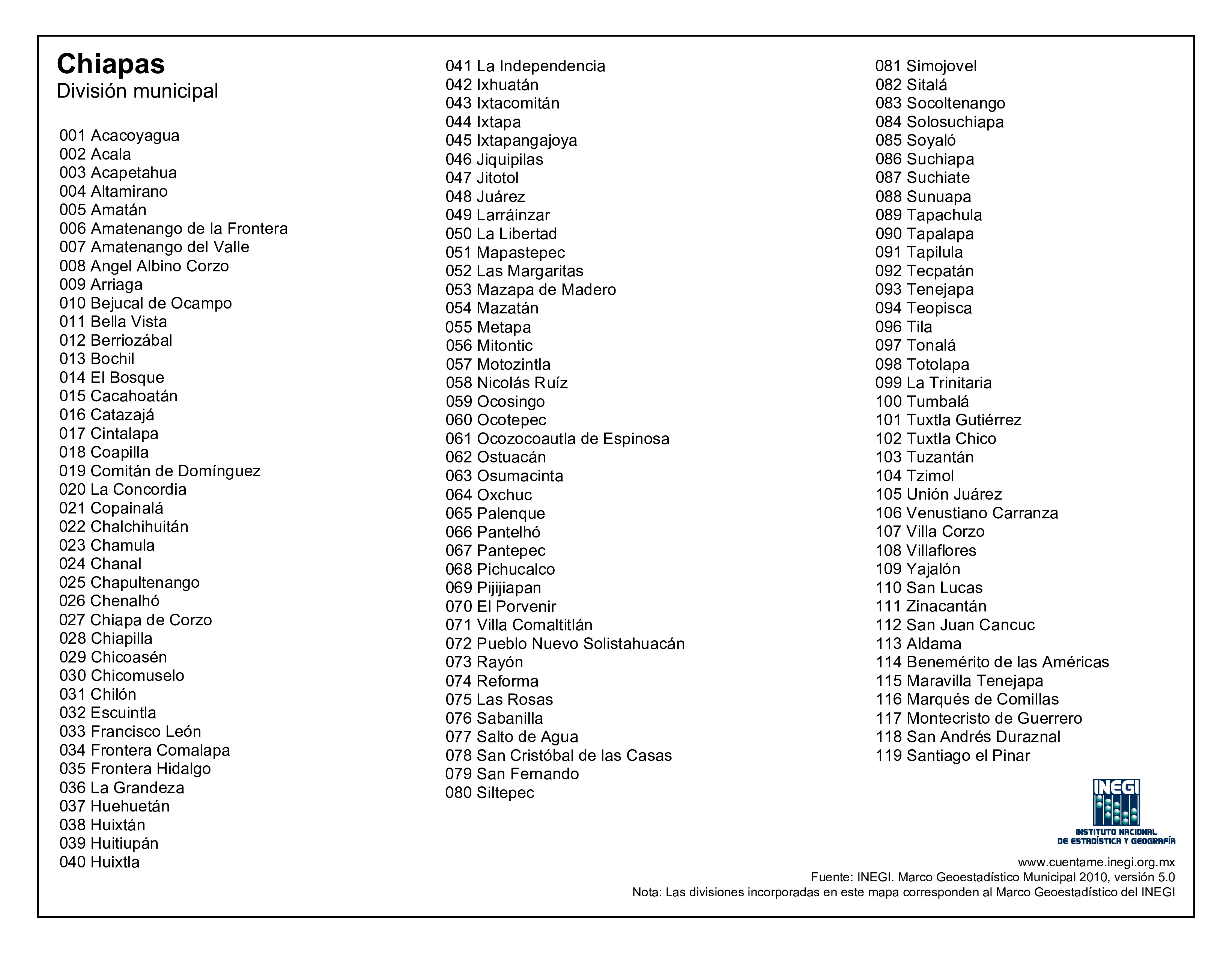 Nota: Algunos municipios fueron de reciente creación (2011–2018), como Mezcalapa, Capitán Luis Ángel Vidal, Honduras de la Sierra, Rincón Chamula San Pedro, entre otros.