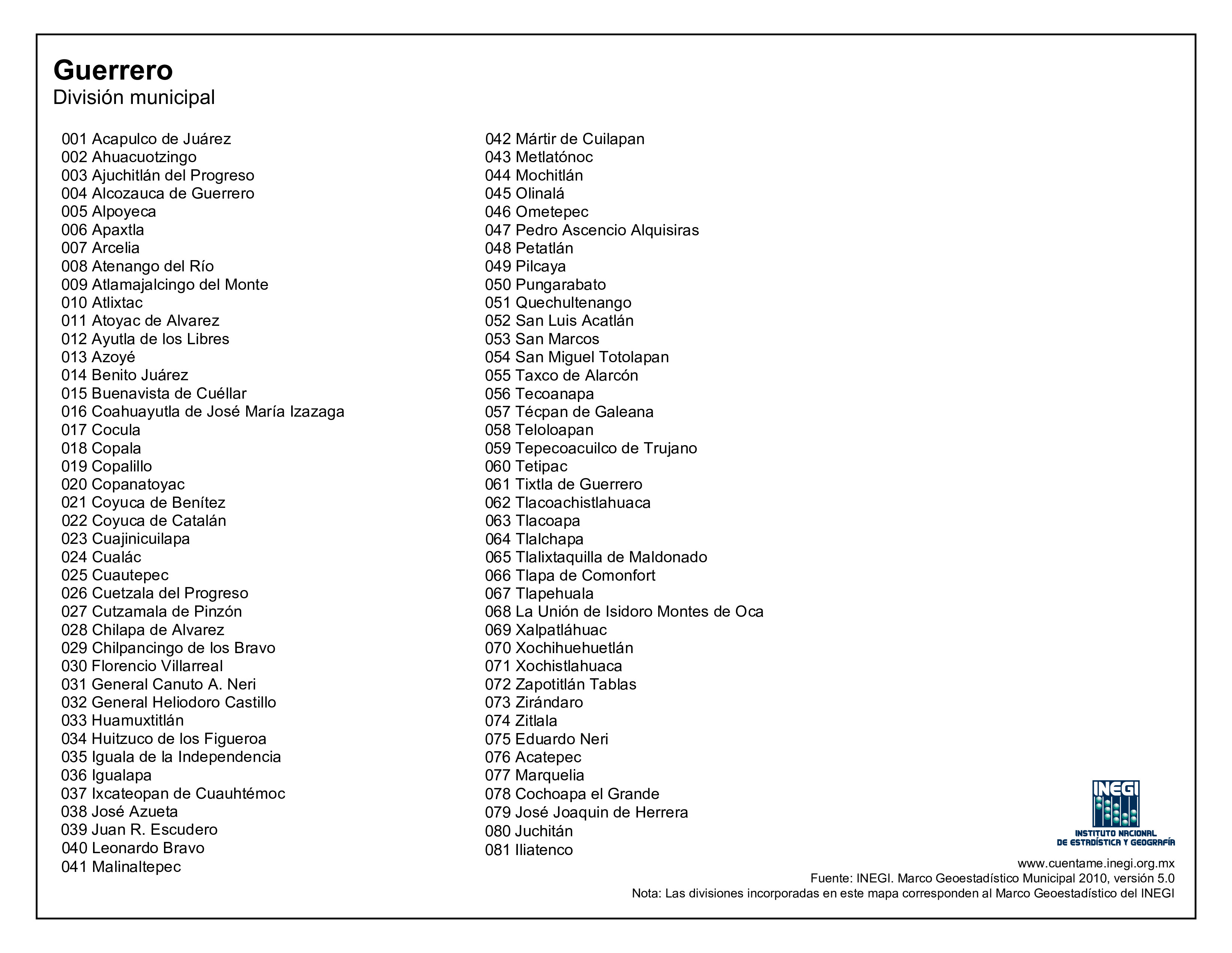 Nota: Algunos municipios tienen nombres largos que incluyen apellidos de héroes de la independencia o de la revolución mexicana, y Guerrero combina zonas costeras, montañosas y rurales, lo que hace que su división municipal sea muy variada.