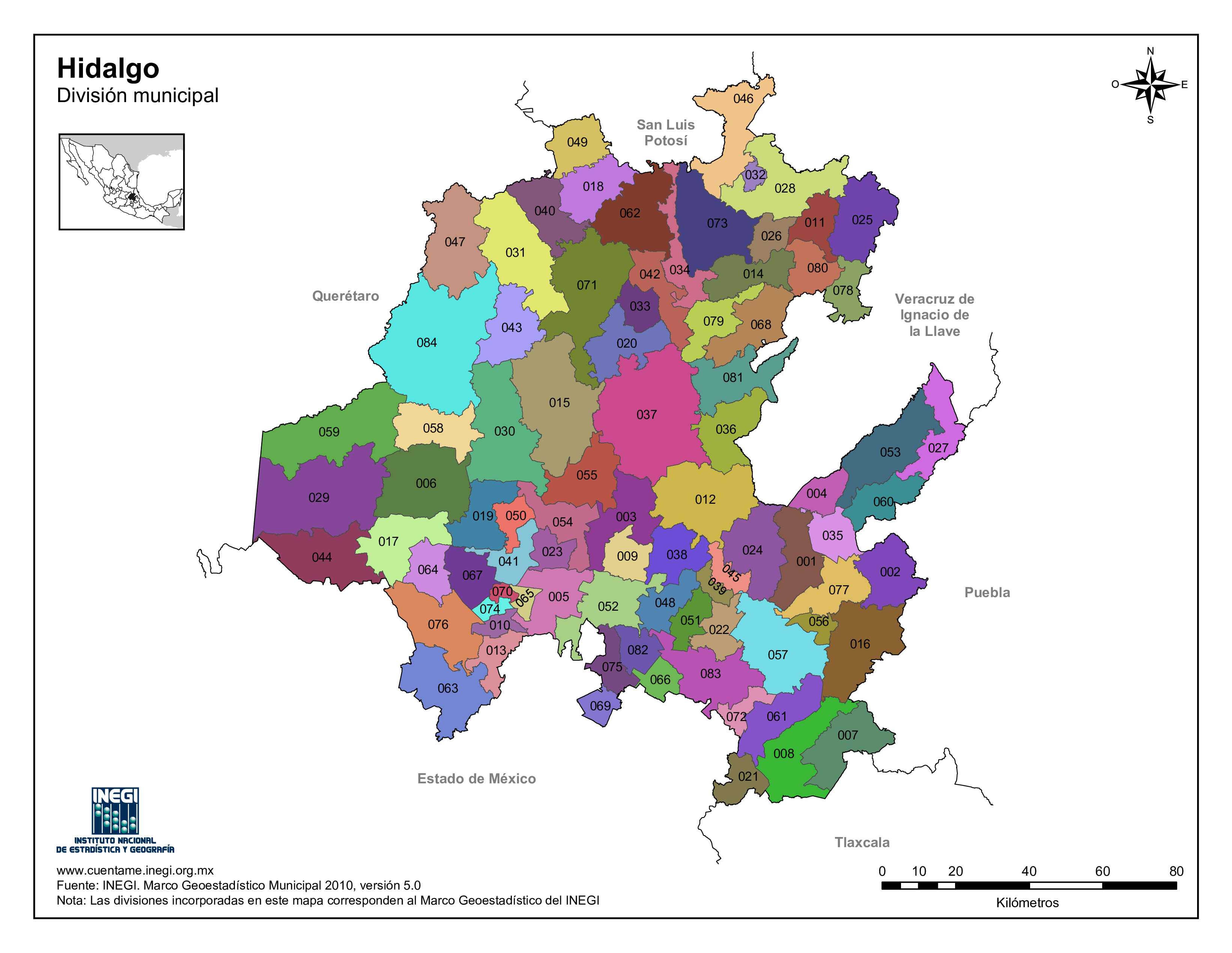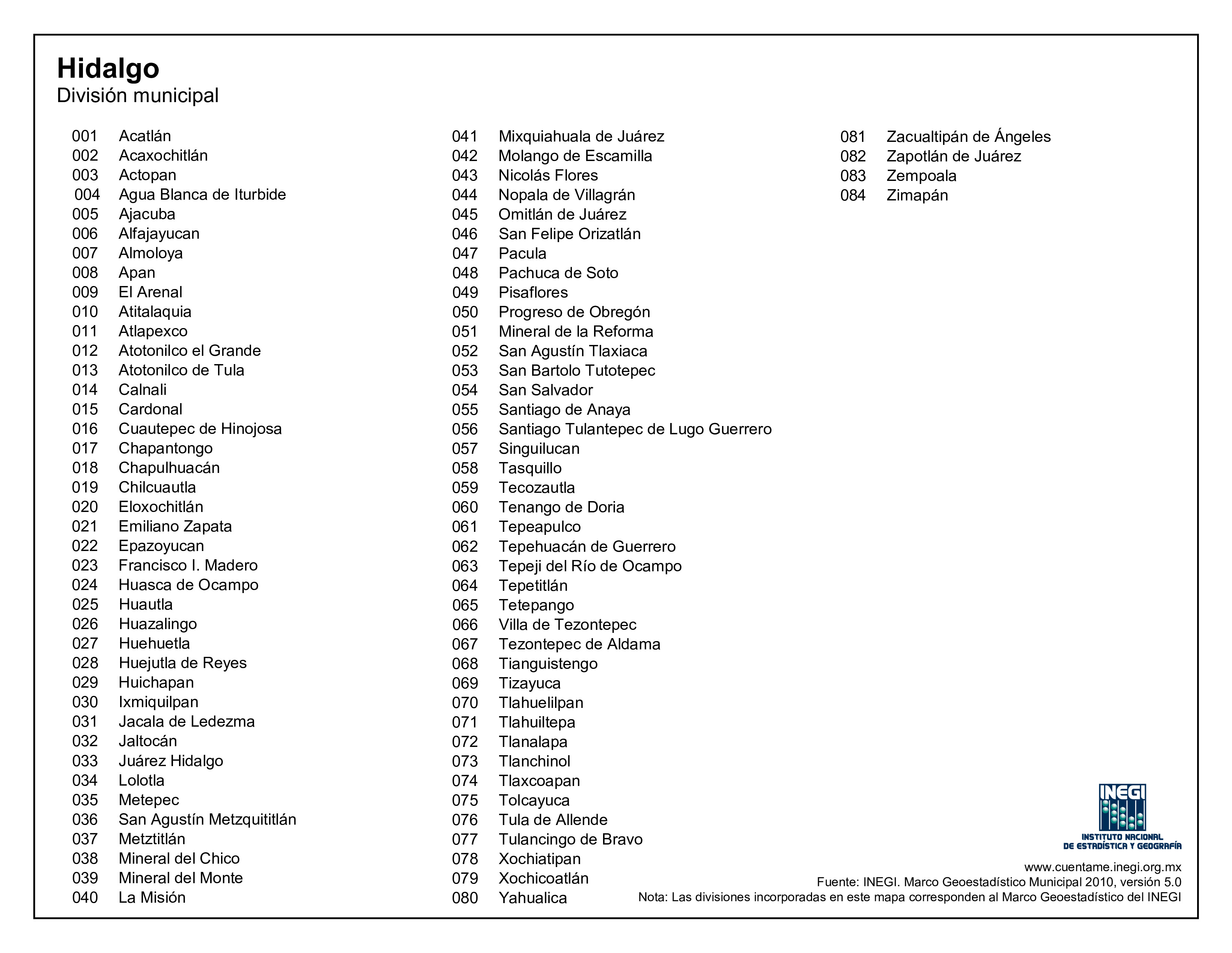 El estado de Hidalgo está dividido en 84 municipios. Aquí la lista completa en orden alfabético: