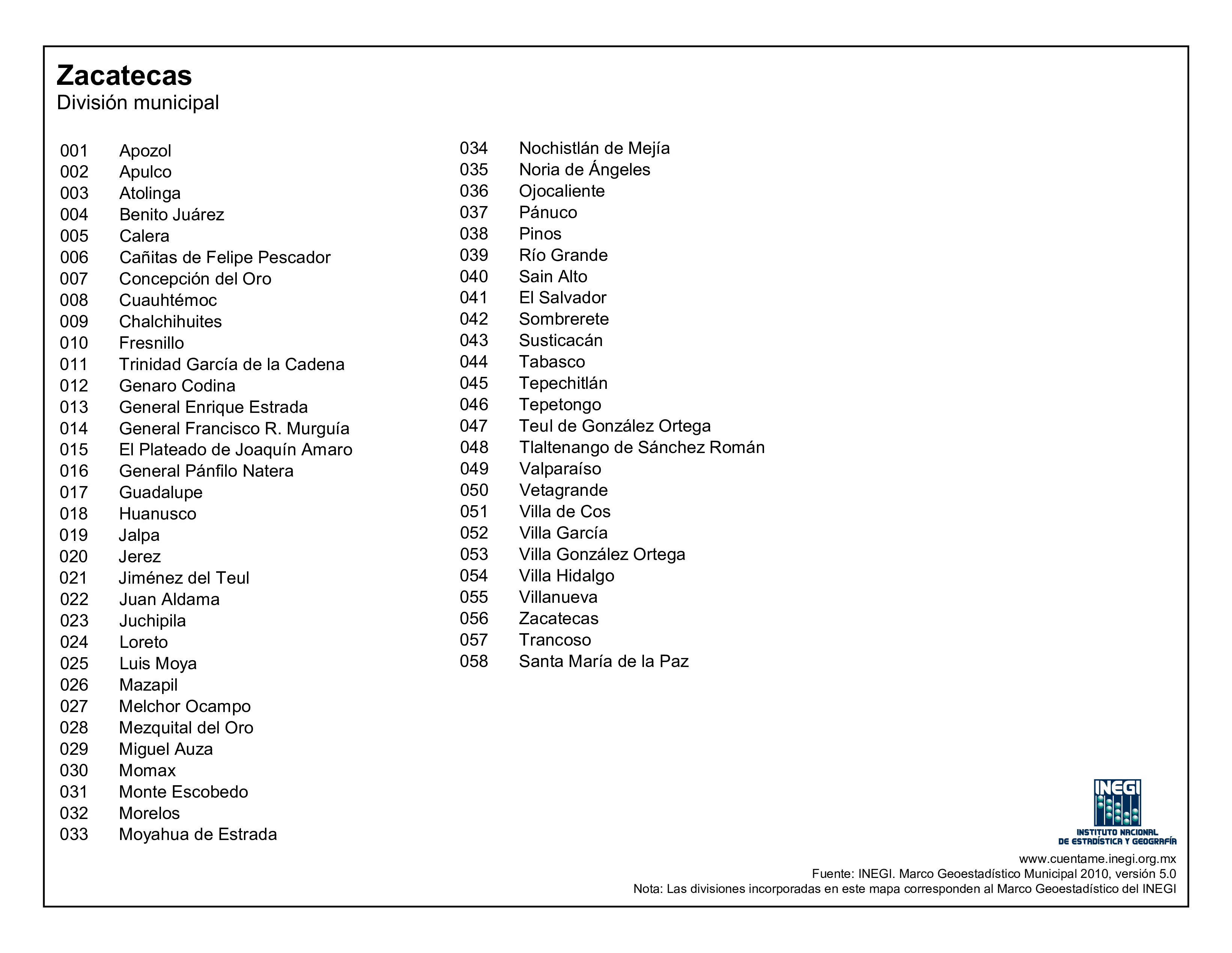 | Sombrerete | Sombrerete | 63 665 | 3607,58 |
