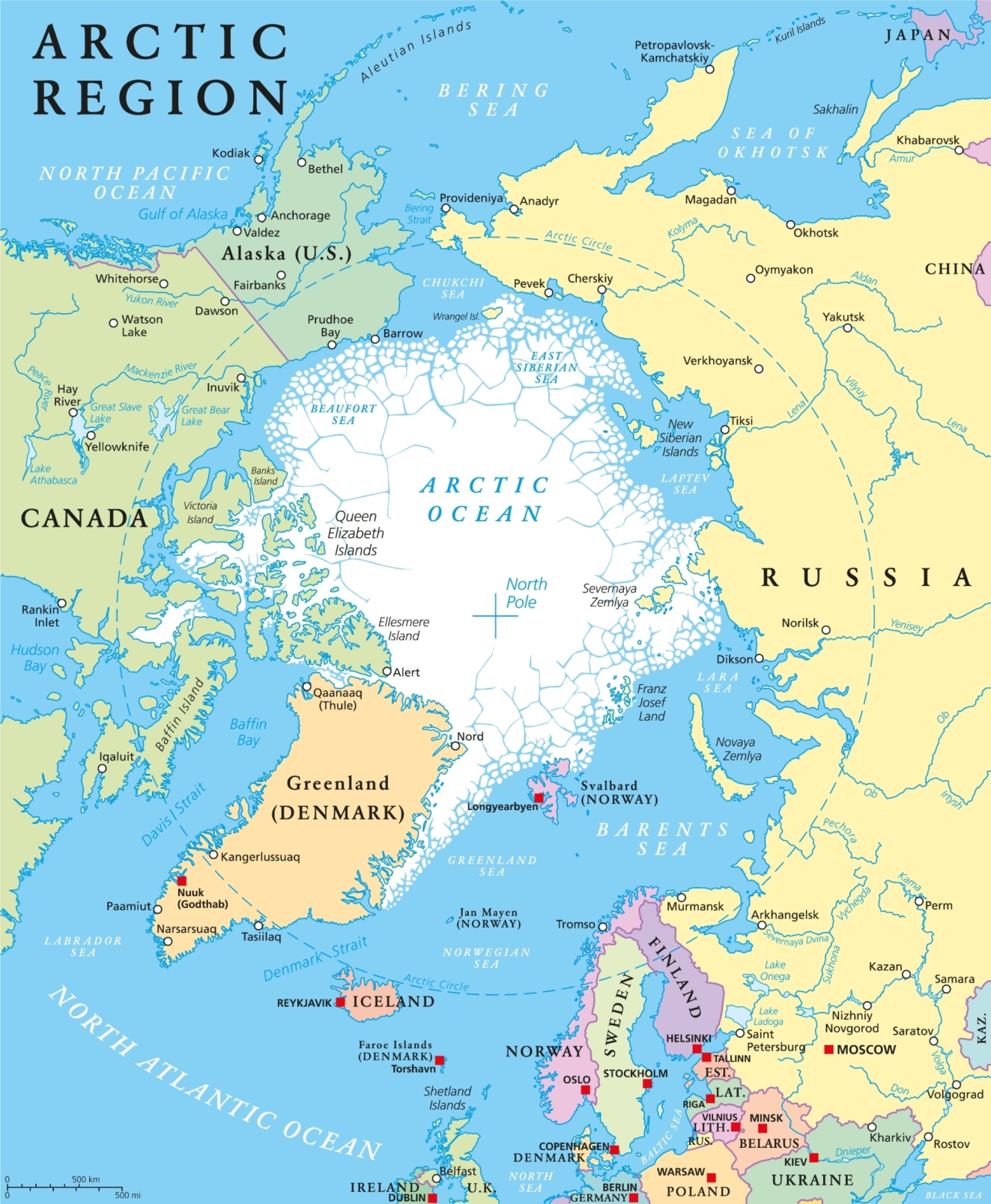 Países costeros del Océano Ártico: Rusia, Canadá, Dinamarca (Groenlandia), Noruega y Estados Unidos.
