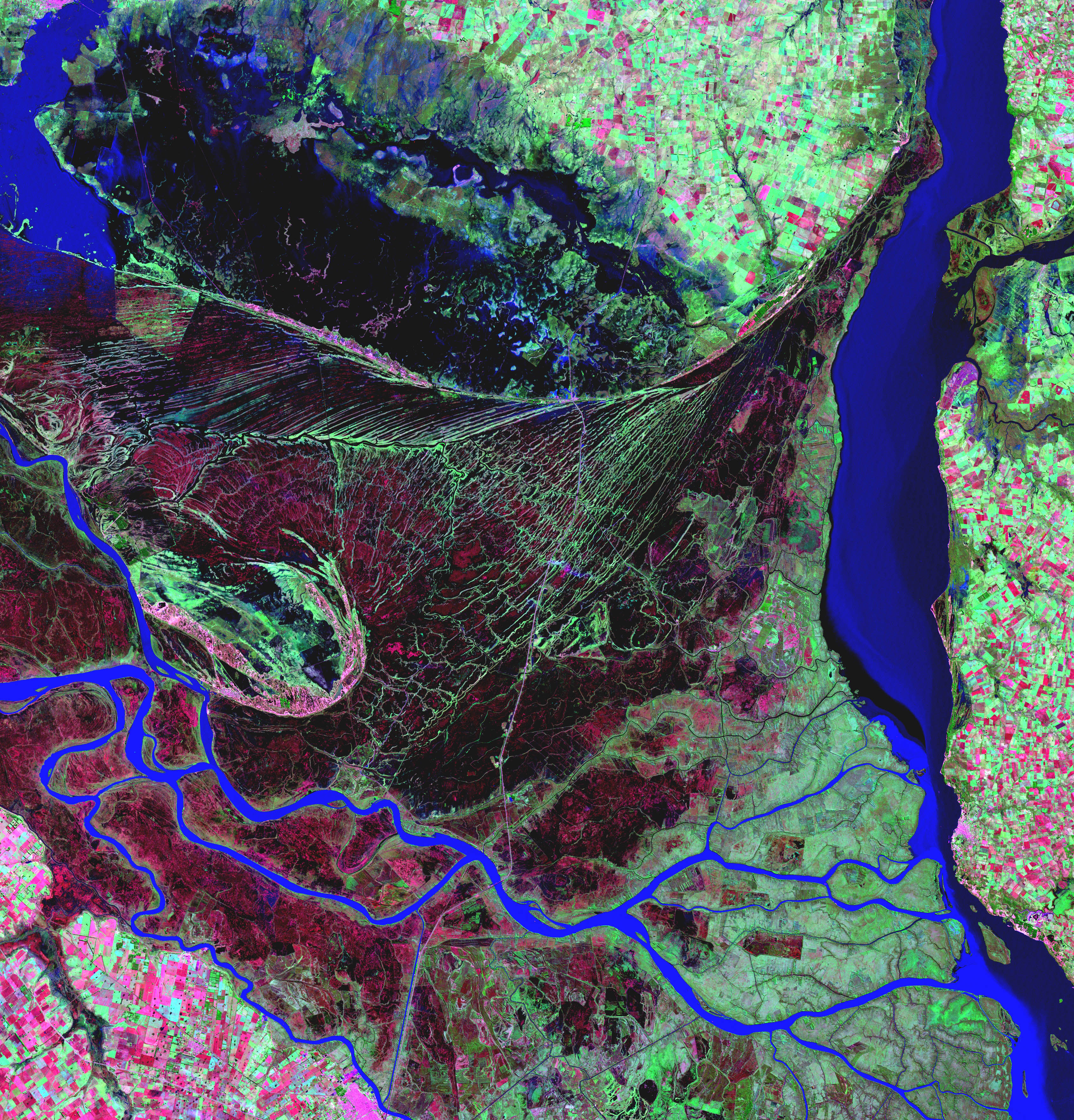 El delta del río Paraná (formato PDF) es una extensa zona de marismas boscosas ubicada a unos 32 kilómetros al noreste de Buenos Aires, Argentina. La zona es un destino turístico muy popular. Se pueden realizar excursiones guiadas en barco por este vasto laberinto de marismas y árboles. El delta del río Paraná es uno de los mejores destinos del mundo para la observación de aves. Esta imagen resalta el sorprendente contraste entre la densa vegetación boscosa y las marismas, y el profundo azul del río Paraná.