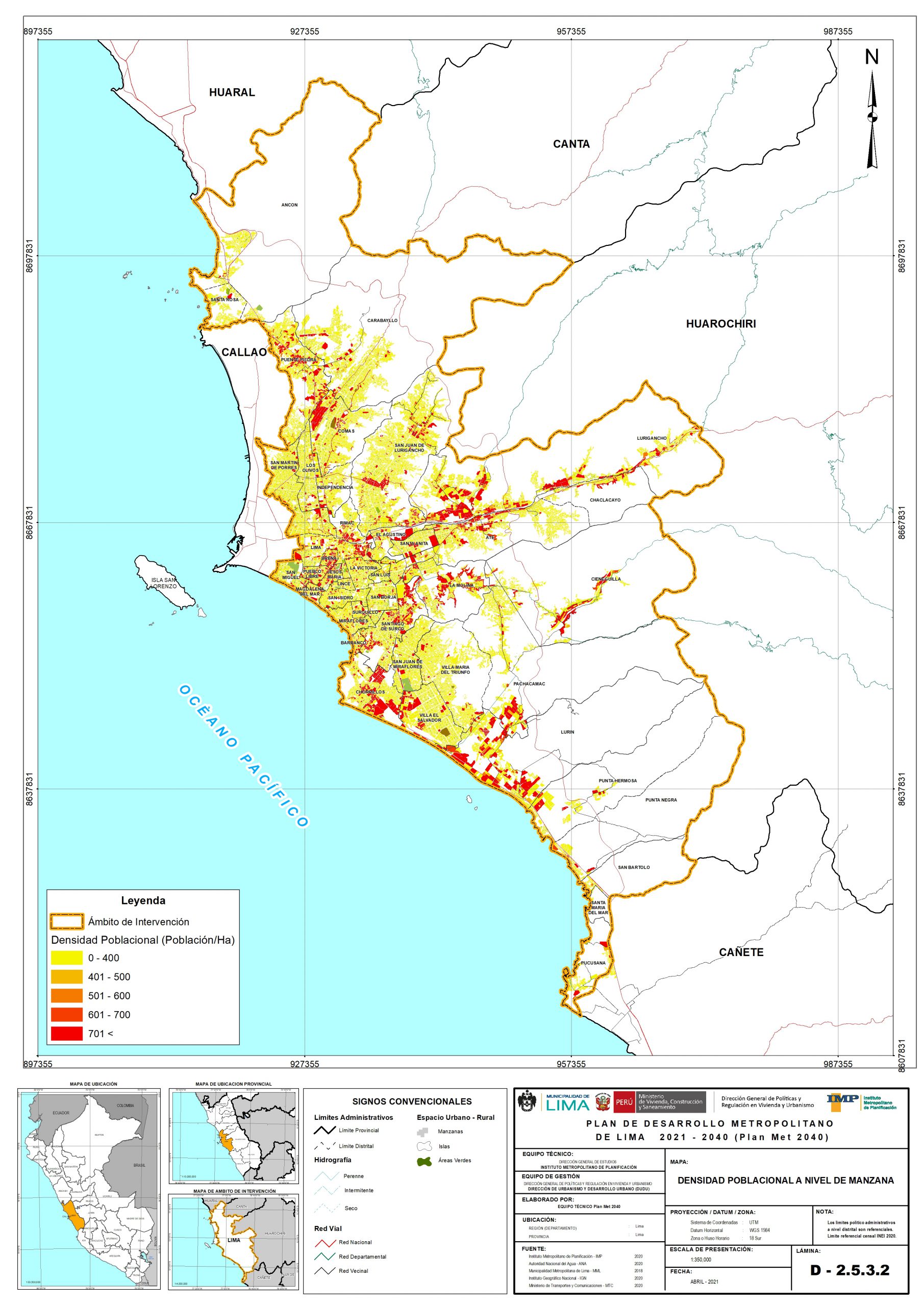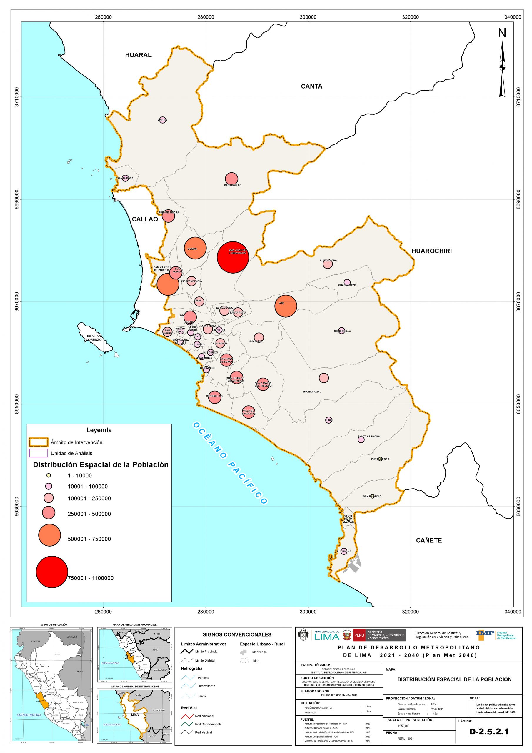 En 2014, el Instituto Nacional de Estadística e Informática informó que la población en los 49 distritos de Lima era de 9.752.000 personas, incluida la Provincia Constitucional del Callao. La ciudad y (área metropolitana) representa alrededor del 29% de la población nacional. De la población de la ciudad, el 48,7% son hombres y el 51,3% son mujeres. Los 49 distritos de Lima Metropolitana se dividen en 5 áreas: Lima Norte, Lima Este, Provincia Constitucional del Callao, Lima Centro y Lima Sur. Las áreas más grandes son Lima Norte con 2.475.432 personas y Lima Este con 2.619.814 personas, incluido el distrito más grande de San Juan de Lurigancho, que alberga a 1 millón de personas.