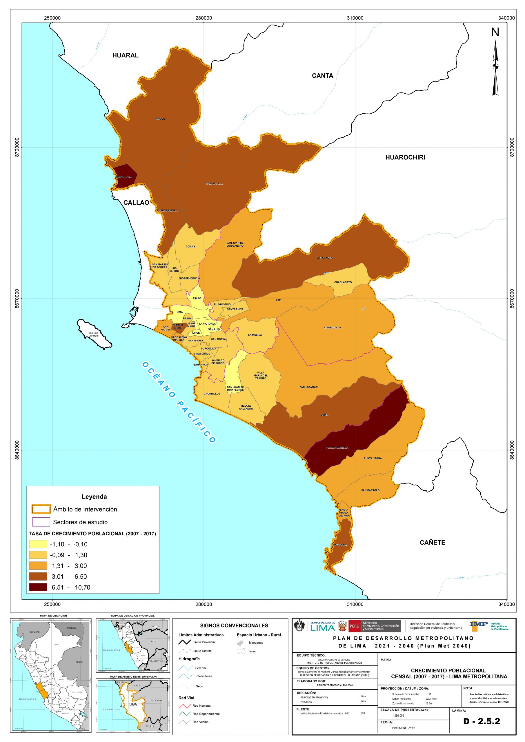 La tasa de crecimiento anual de la población es del 1,57%. Algunos de los 43 distritos metropolitanos están considerablemente más poblados que otros. Por ejemplo, San Juan de Lurigancho, San Martín de Porres, Ate, Comas, Villa El Salvador y Villa María del Triunfo albergan a más de 400.000 habitantes, mientras que San Luis, San Isidro, Magdalena del Mar, Lince y Barranco tienen menos de 60.000 habitantes.