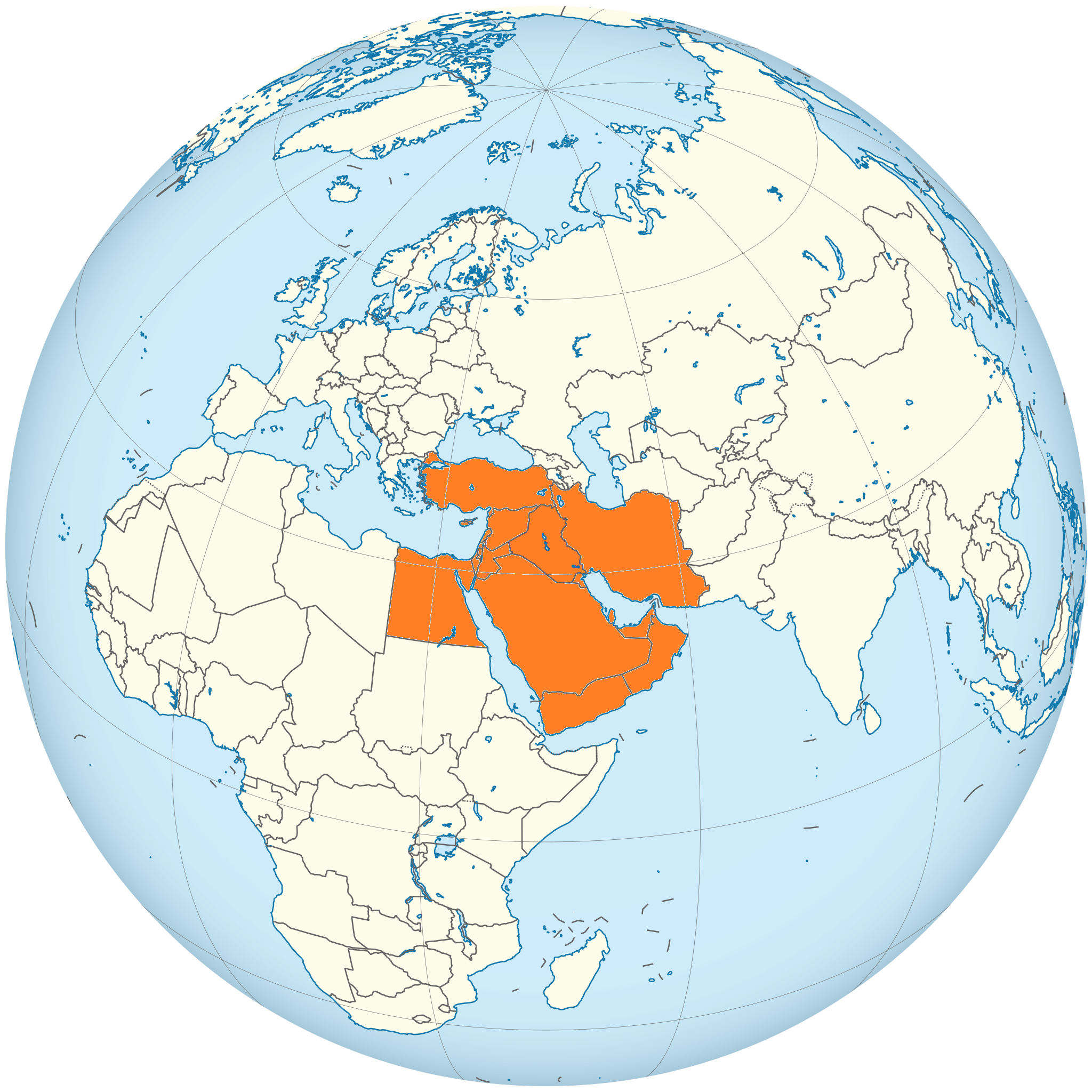 Incluye la península arábiga, el Levante mediterráneo, la Mesopotamia y parte de Anatolia (Turquía).
