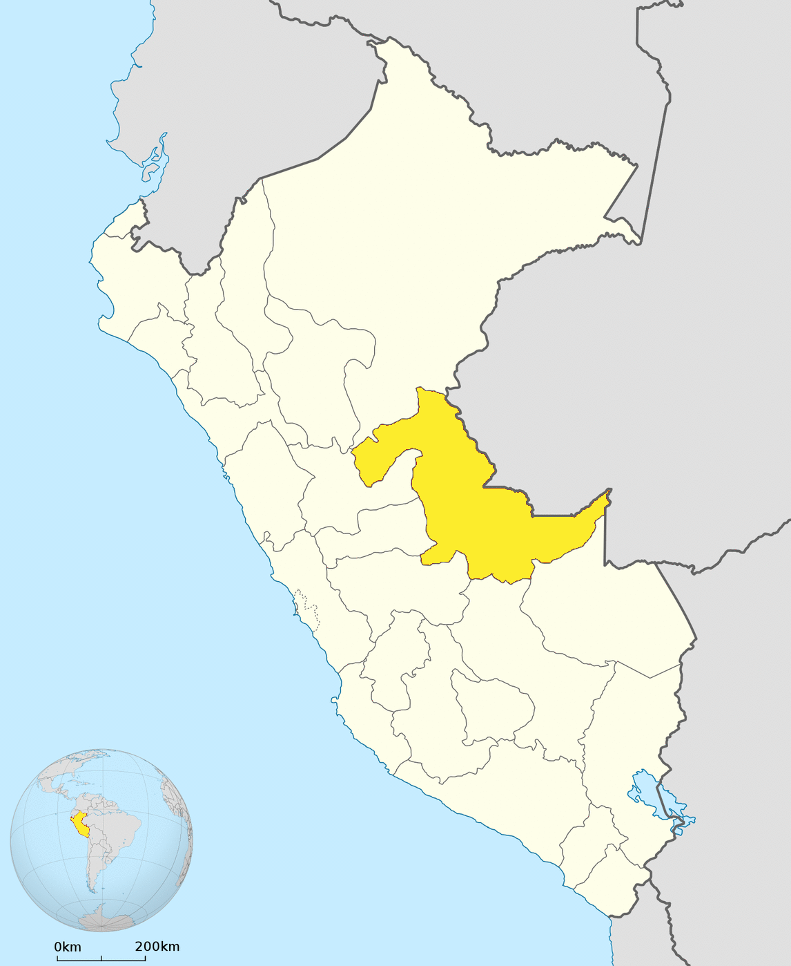 El departamento de Ucayali (en amarillo en el mapa arriba) se encuentra ubicado en la zona centro-oriental del Perú, en la selva amazónica. Colinda con el estado brasileño de Acre al este; el departamento de Madre de Dios al sureste; Cusco al sur; Junín, Pasco y Huánuco por el oeste; y Loreto en el norte.