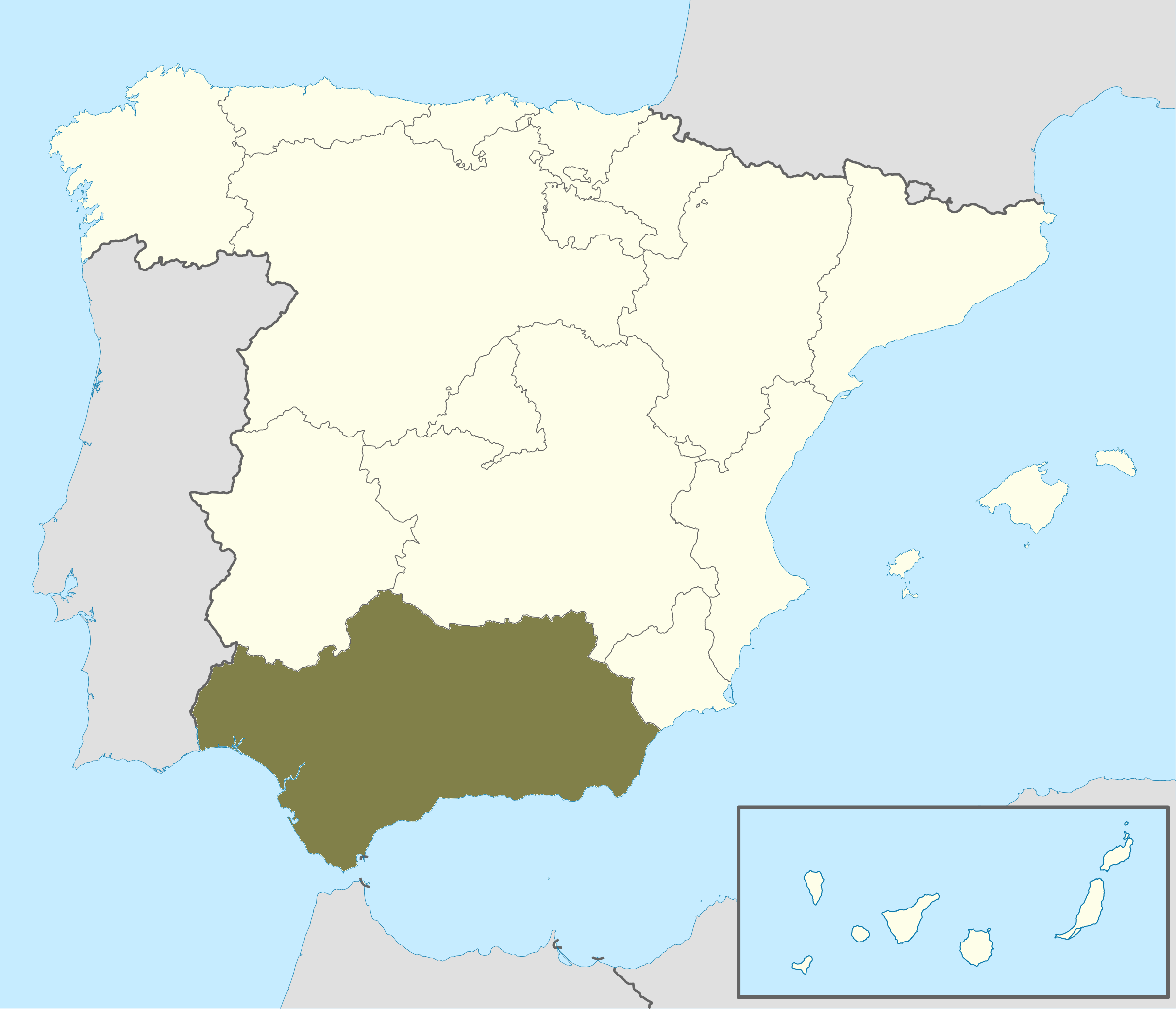 Andalucía (en color oliva en el mapa arriba) se encuentra en la parte meridional de la península ibérica; limitando al oeste con Portugal, al norte con las comunidades autónomas de Extremadura (Badajoz) y Castilla-La Mancha (Ciudad Real y Albacete), al este con la Región de Murcia, al suroeste con el océano Atlántico y al sur con el mar Mediterráneo y Gibraltar. A través del estrecho de Gibraltar, separado por 14 km en su parte más estrecha, se encuentran Marruecos y Ceuta en el continente africano.