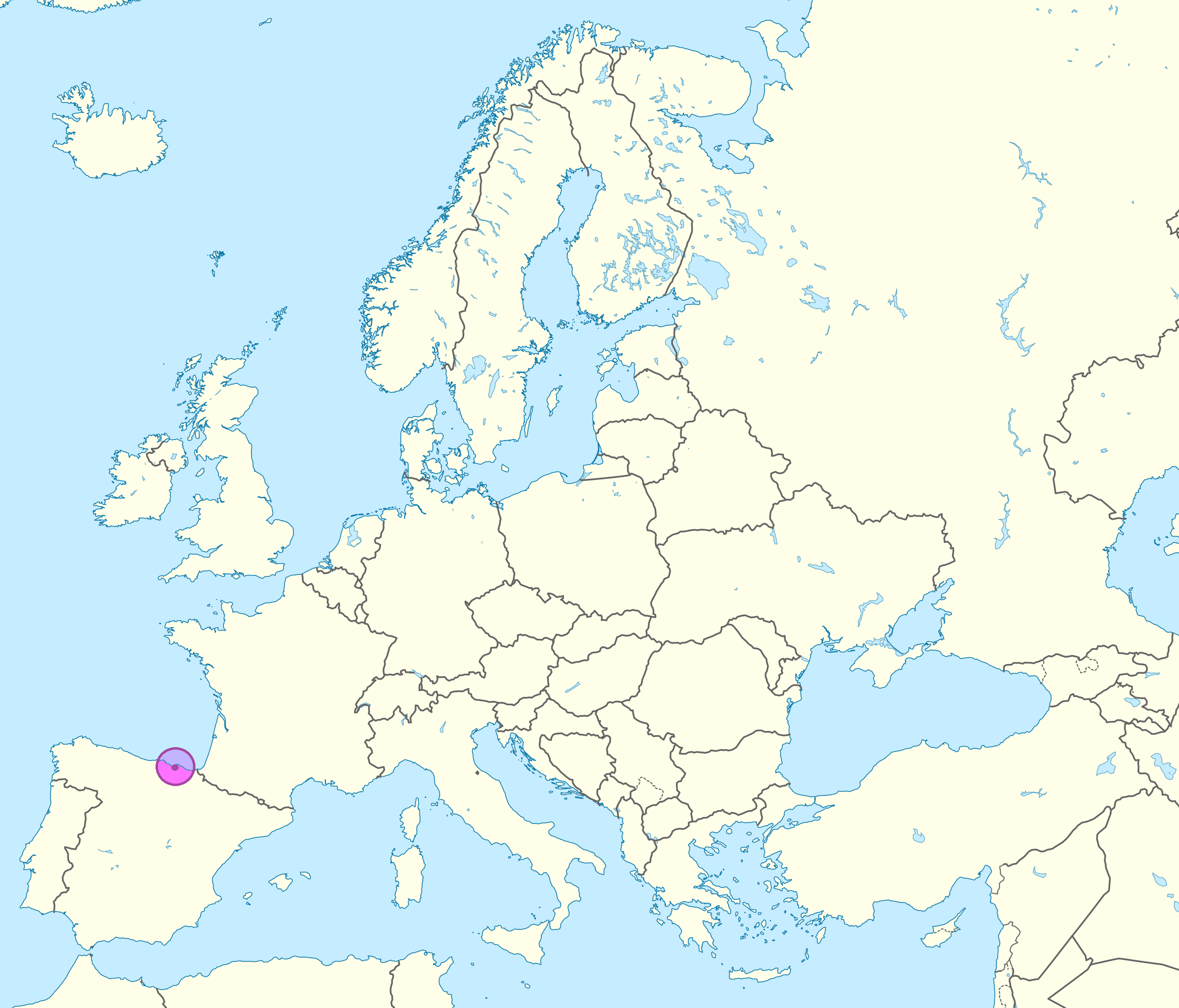 La ciudad de Bilbao (en violeta en los mapas de arriba y de abajo) se encuentra en la parte centro-norte de España, a unos 16 kilómetros al sur del Golfo de Vizcaya.