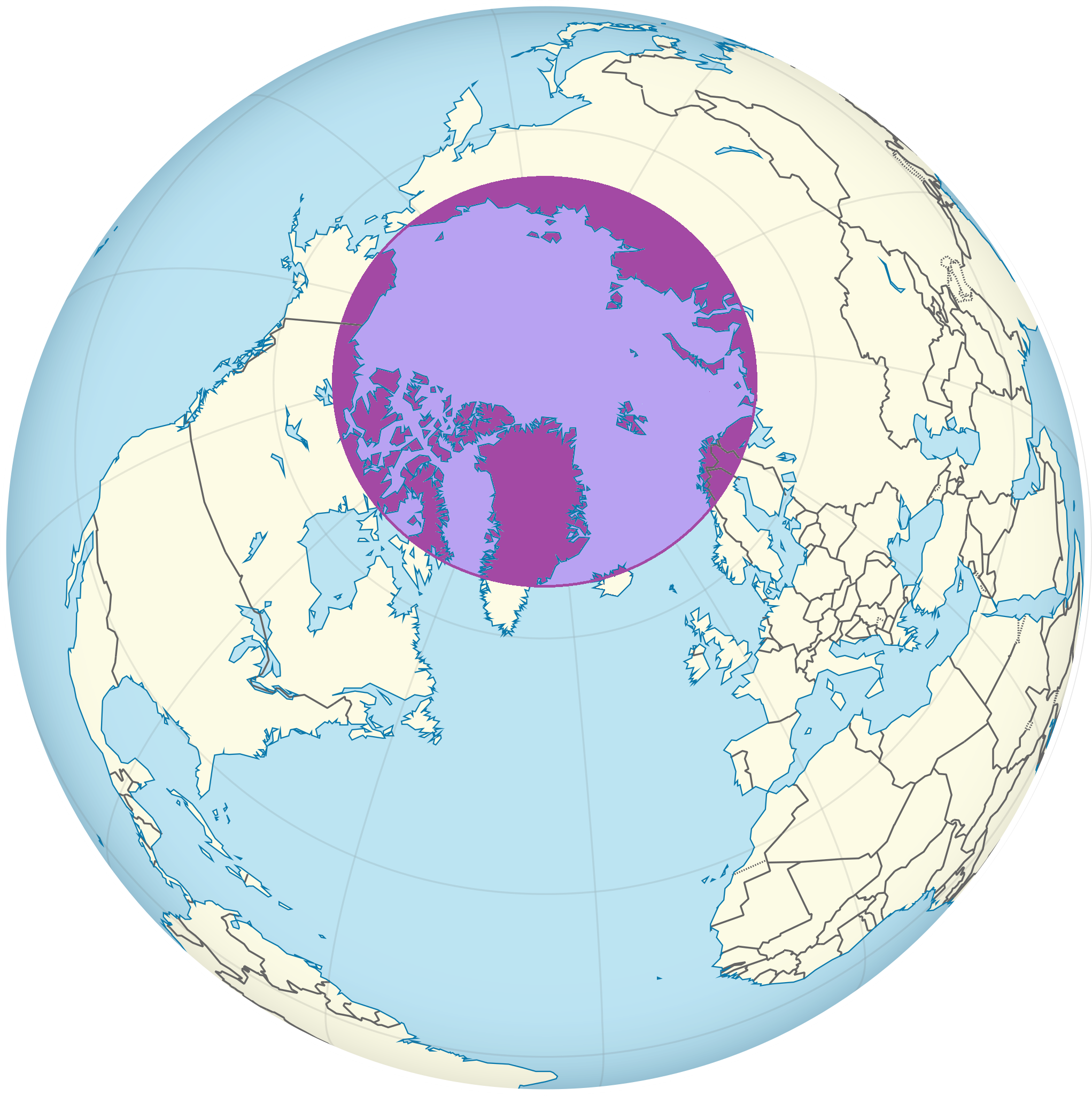 El Ártico (en violeta en el mapa de arriba) se encuentra en el extremo norte de la Tierra, alrededor del Océano Glacial Ártico y más allá del Círculo Polar Ártico (aproximadamente a los 66°33′ de latitud norte).