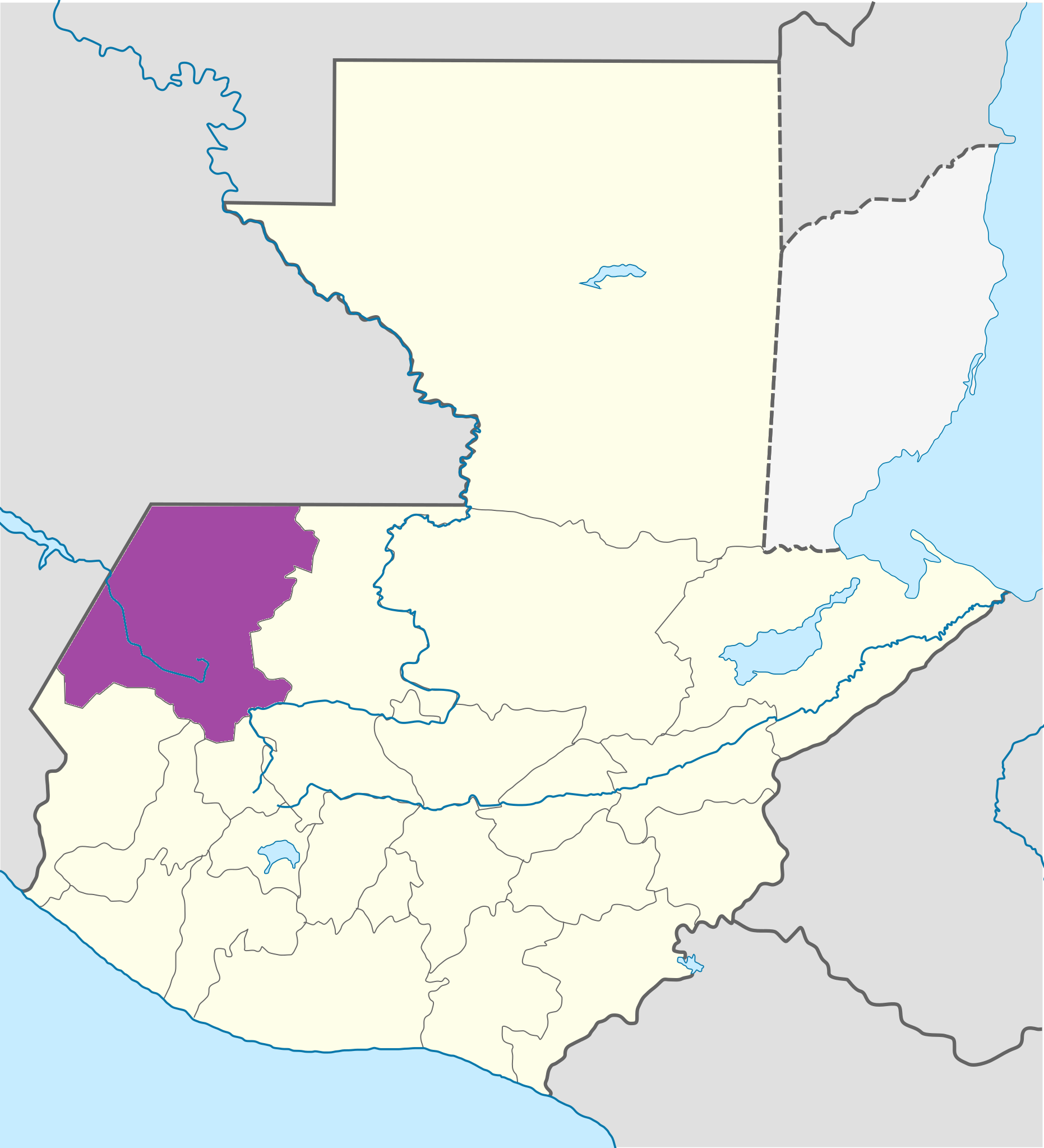 El Departamento de Huehuetenango (en color violeta en el mapa arriba) se encuentra en la región noroccidental de Guatemala, formando parte clave del Altiplano Occidental y la frontera con México.