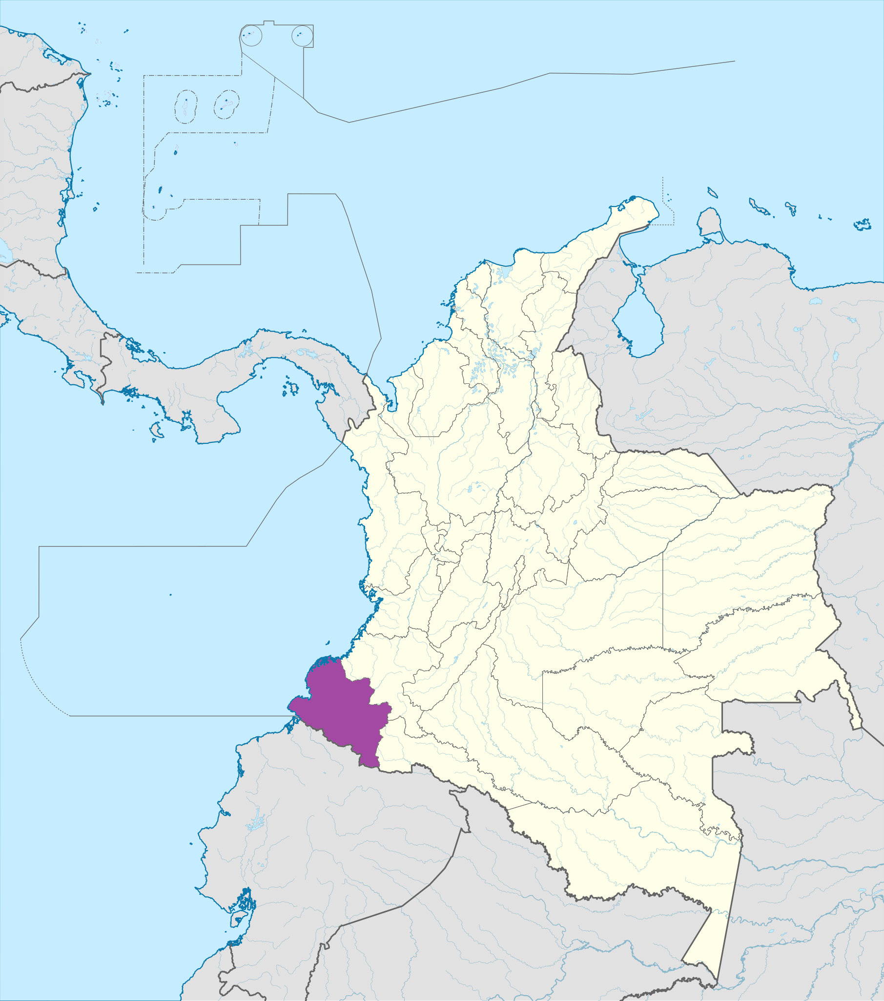 El departamento de Nariño (en violeta en el mapa de arriba) está ubicado en el suroccidente de Colombia, en la región Andina y con salida al océano Pacífico.