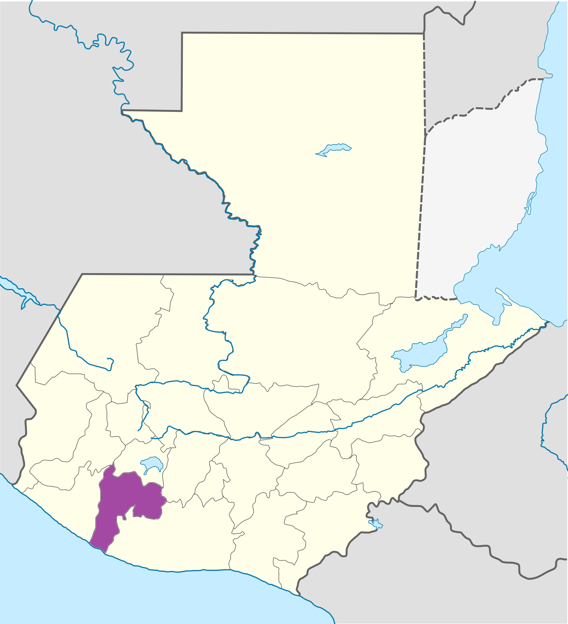 El Departamento de Suchitepéquez (en color violeta en el mapa arriba) se encuentra ubicado en la región sur-occidental de Guatemala, aproximadamente a 165 km al suroeste de la Ciudad de Guatemala, formando parte de la franja conocida como la Costa Sur, una de las zonas agrícolas más productivas del país.