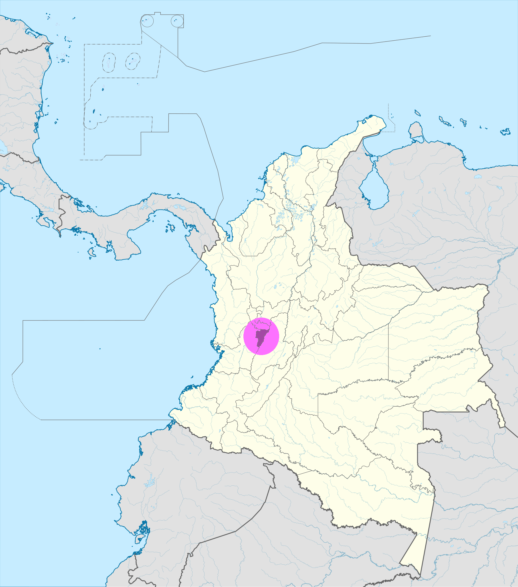 El departamento del Quindío (en violeta en el mapa de arriba) se encuentra en el centro-occidente de Colombia, en la región conocida como el Eje Cafetero.