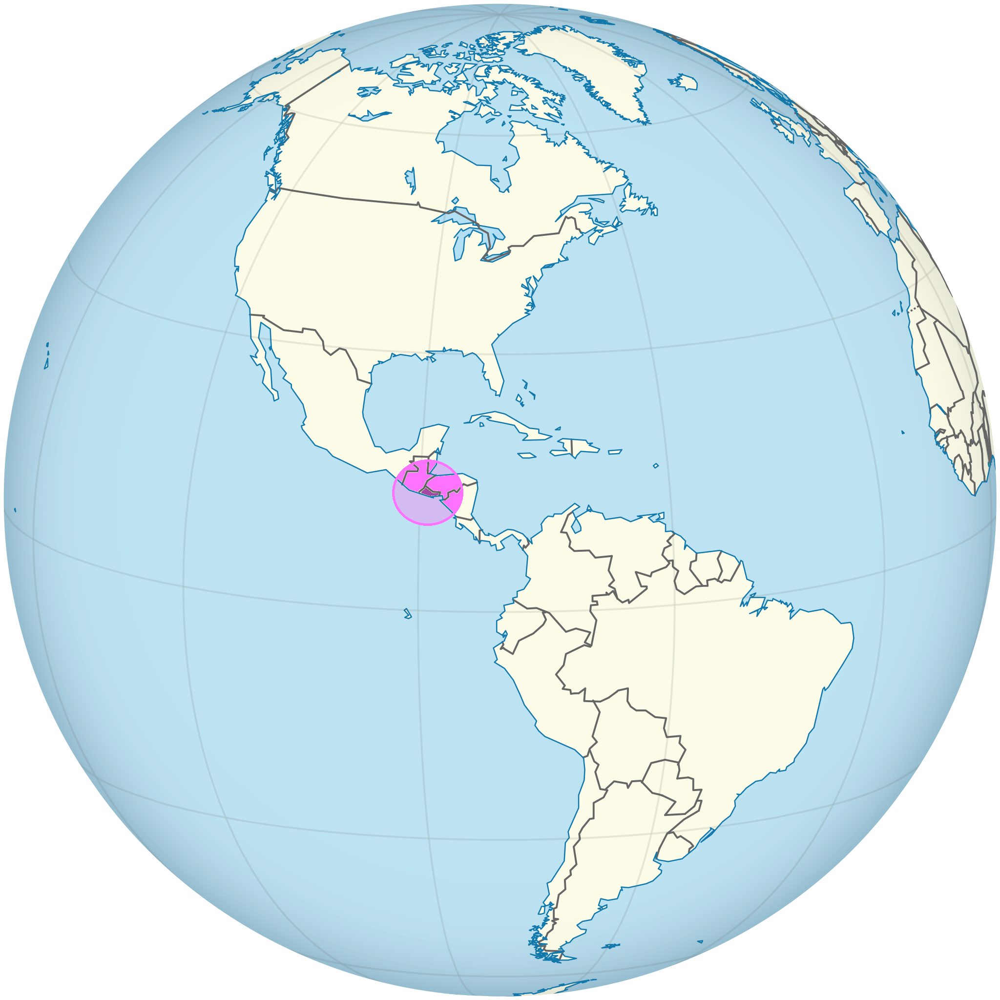 El Salvador (en violeta en los mapas de arriba y abajo) se encuentra en Centroaméric en el litoral del océano Pacífico, entre las latitudes 13° y 15°N, y las longitudes 87° y 91°O.