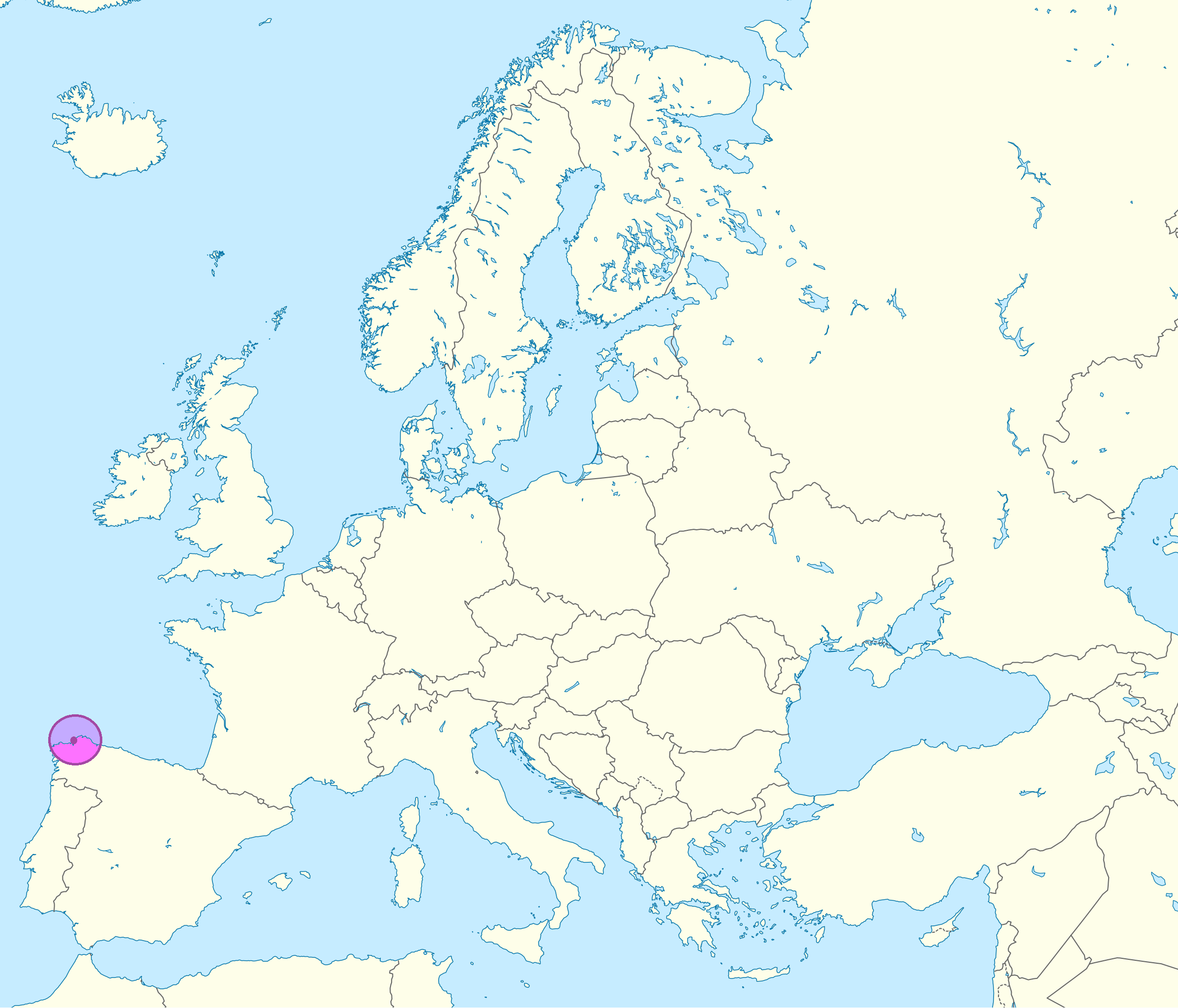 Ferrol (en violeta en los mapas de arriba y de abajo) se encuentra en el noroeste de la provincia de La Coruña, perteneciente a Galicia, situada a su vez en el noroeste de la península ibérica.