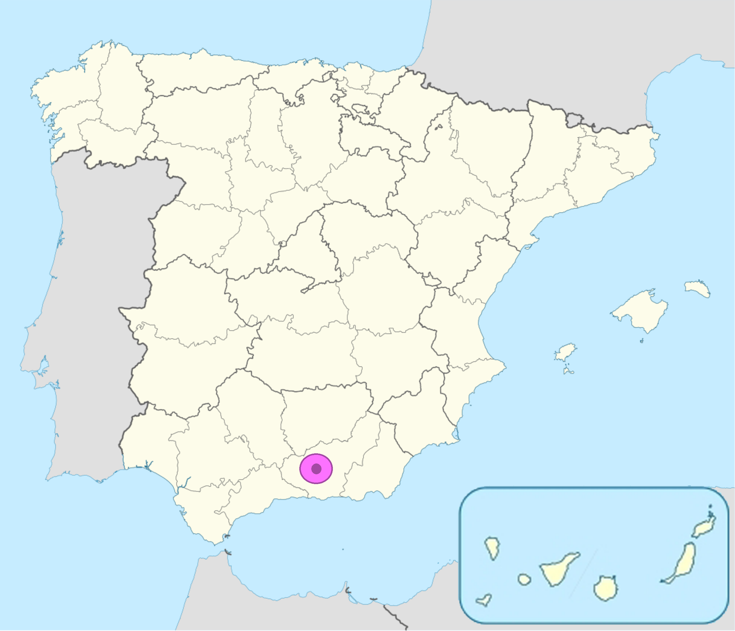 La ciudad de Granada (en violeta en los mapas de arriba y de abajo) se encuentra en la parte sureste de Andalucía, región que abarca el sur de España. La ciudad de Granada se asienta sobre la Vega de Granada, una de las depresiones o llanuras situadas dentro de las cordilleras Béticas, continuada al oeste por las de Archidona y Antequera y al este por las de Guadix, Baza y Huéscar.