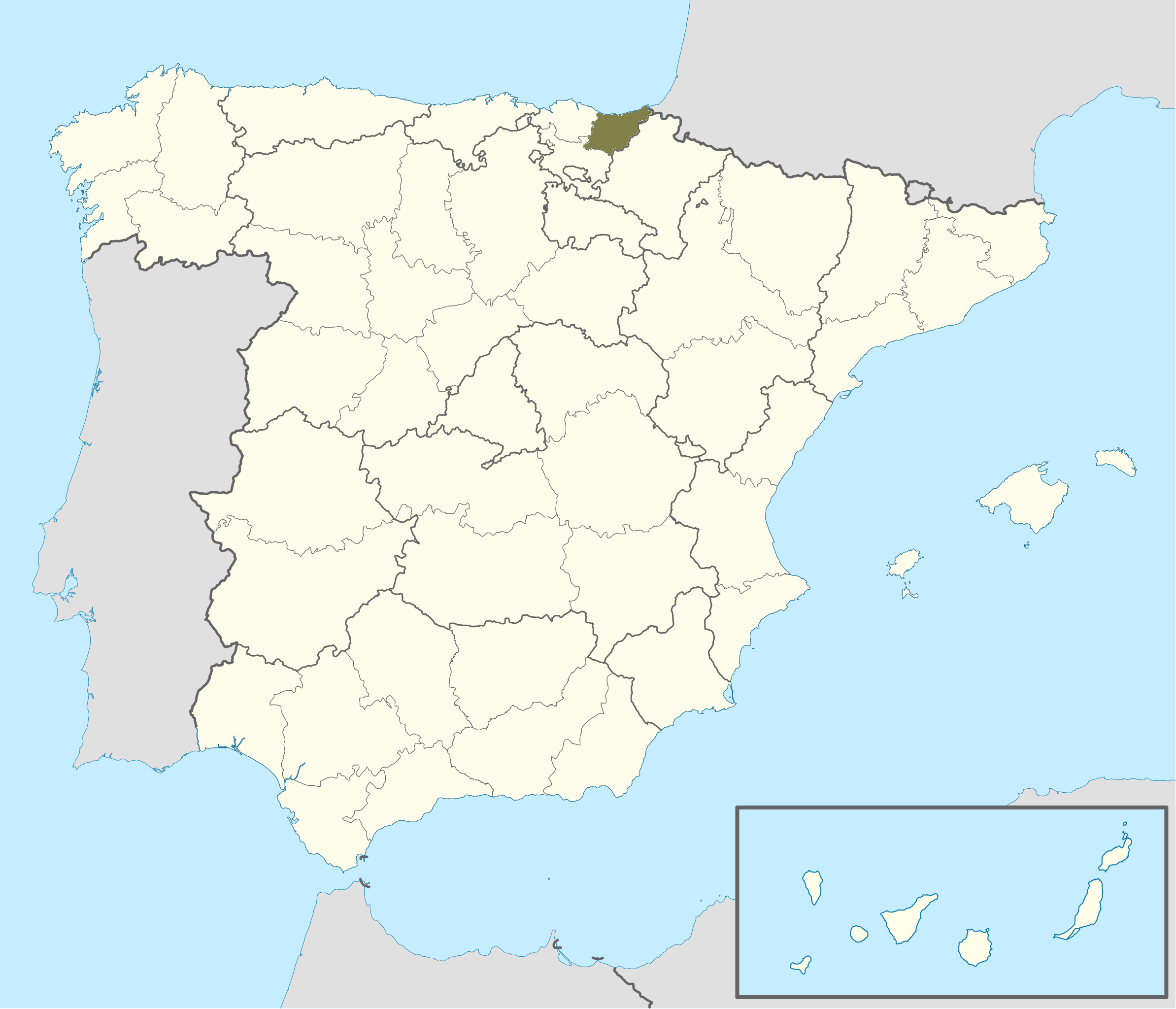 Guipúzcoa (en color oliva en el mapa arriba) se encuentra al norte de España, en el extremo este del mar Cantábrico y limita con el departamento francés de Pirineos Atlánticos al noreste, con Navarra al sur y al sureste, con Vizcaya al oeste, con Álava al suroeste y con el golfo de Vizcaya al norte.