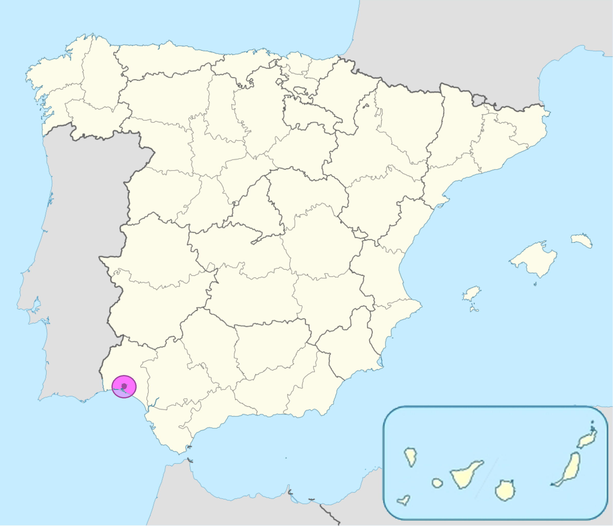La ciudad de Huelva (en violeta en los mapas de arriba y de abajo) se encuentra al suroeste de la Península Ibérica, en el Golfo de Cádiz, frente al Océano Atlántico. La ciudad se sitúa junto a la ría formada por la confluencia de los ríos Odiel y Tinto, encajonada entre ambos ríos.
