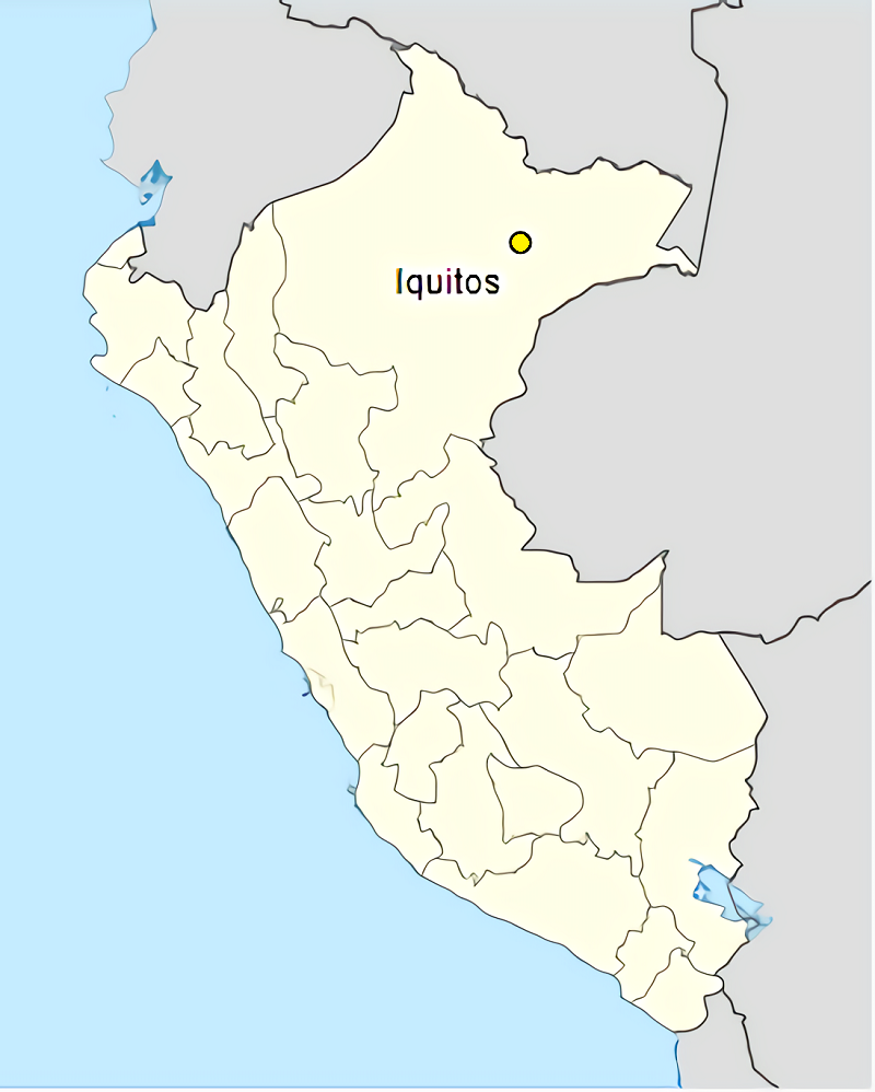 La ciudad de Iquitos (en amarillo en los mapas arriba y abajo) se encuentra ubicada en en el nororiente del Perú, centro este del Departamento de Loreto y en el extremo sur de la Provincia de Maynas, en la Amazonía peruana, al este de los Andes.