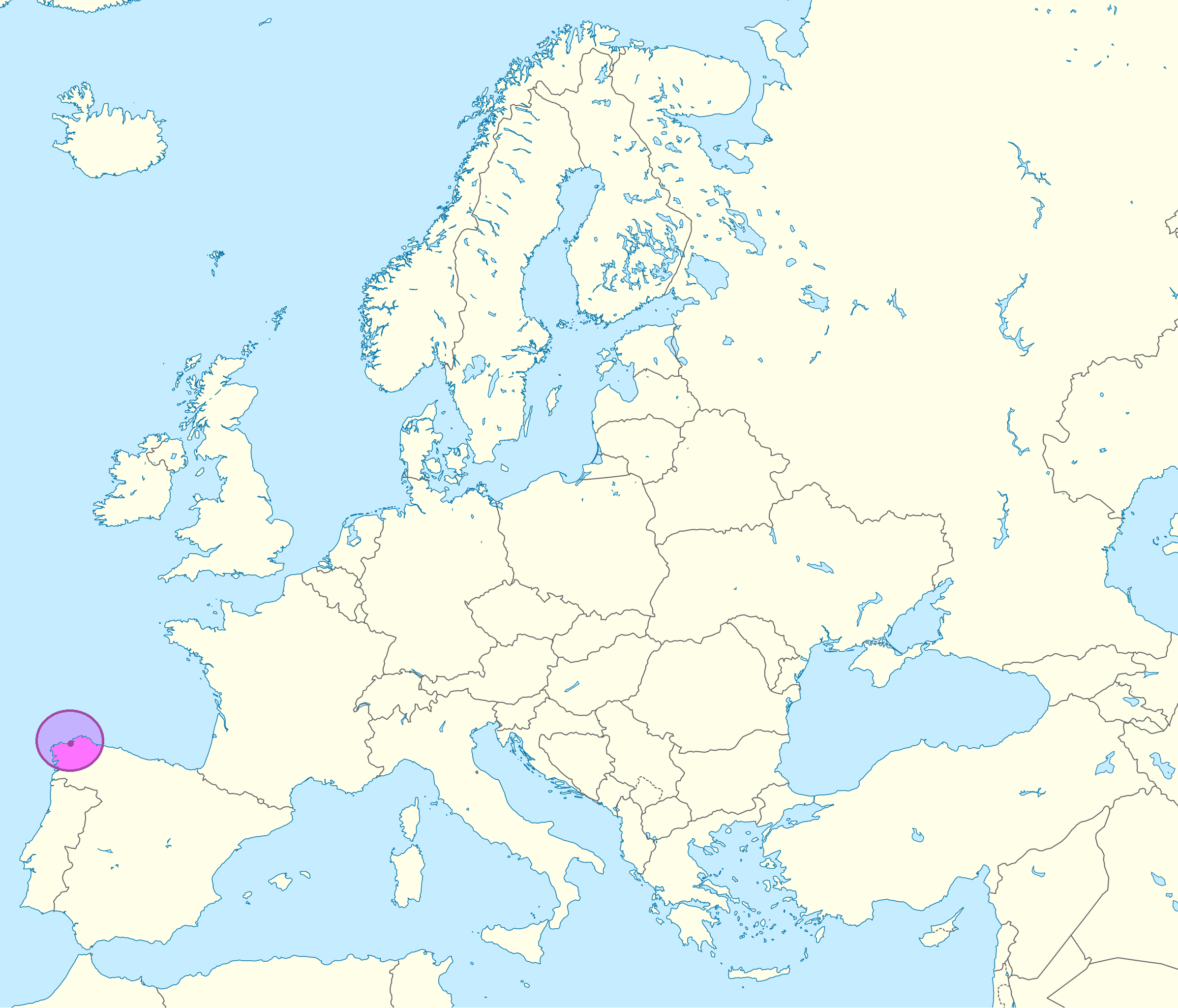 La Coruña (en violeta en los mapas de arriba y de abajo) se encuentra en la provincia de La Coruña, perteneciente a la Comunidad Autónoma de Galicia, en el noroeste de la península ibérica.