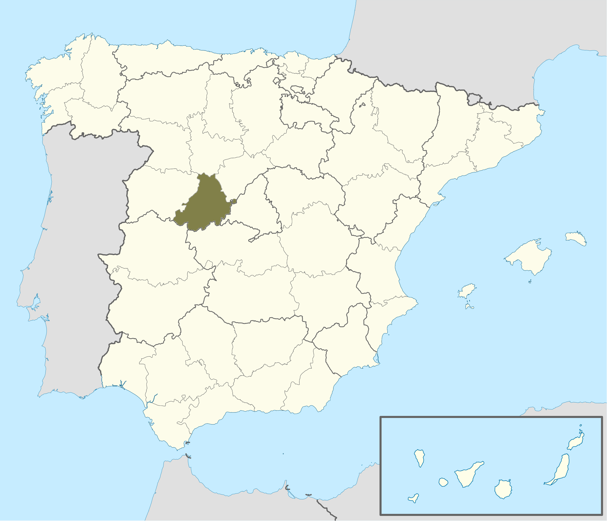 La provincia de Ávila (en color oliva en el mapa arriba) se encuentra en el centro-oeste de España, al sur de la comunidad autónoma de Castilla y León.