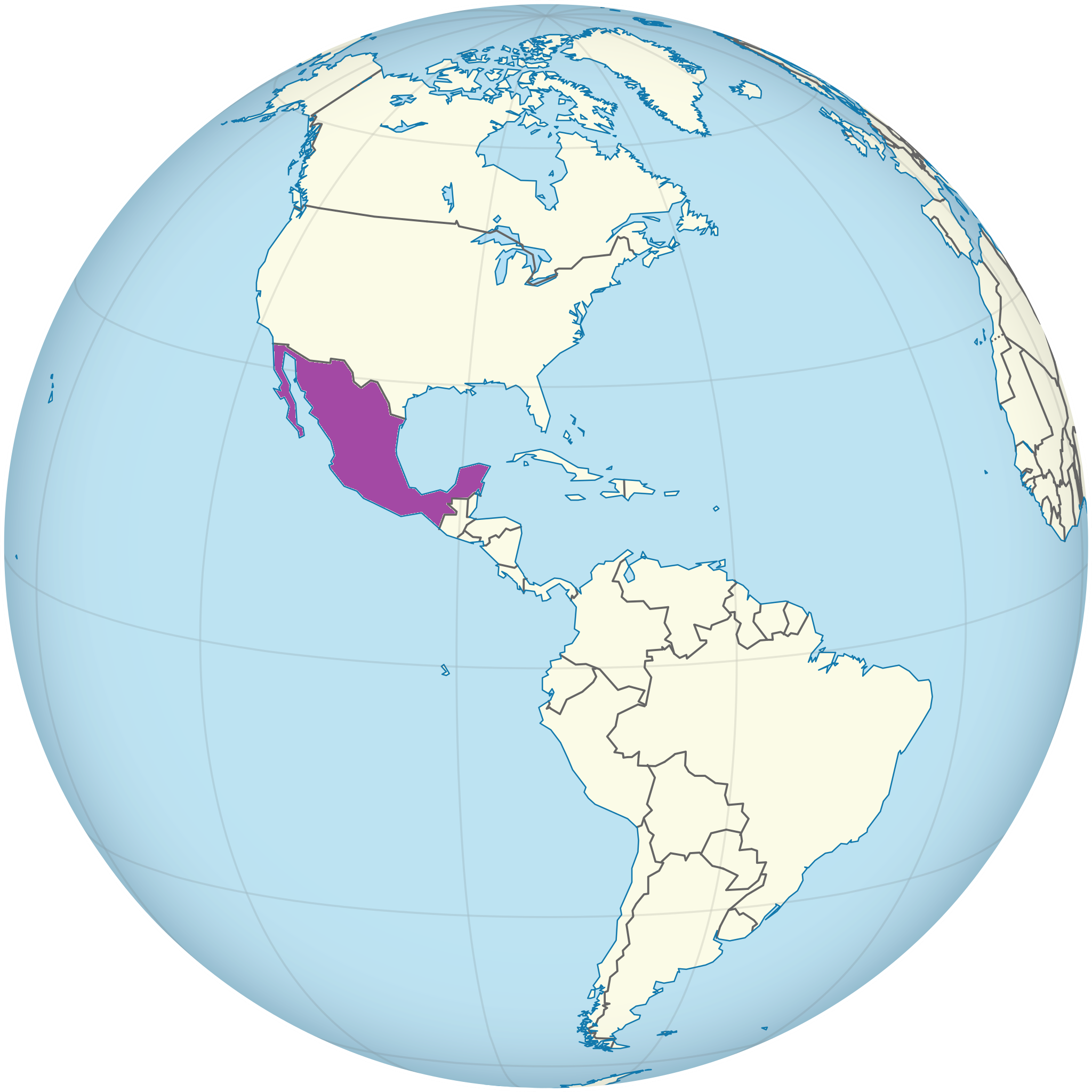 México (en morado en los mapas de arriba y de abajo) se encuentra en el continente americano, específicamente en la región de América del Norte.