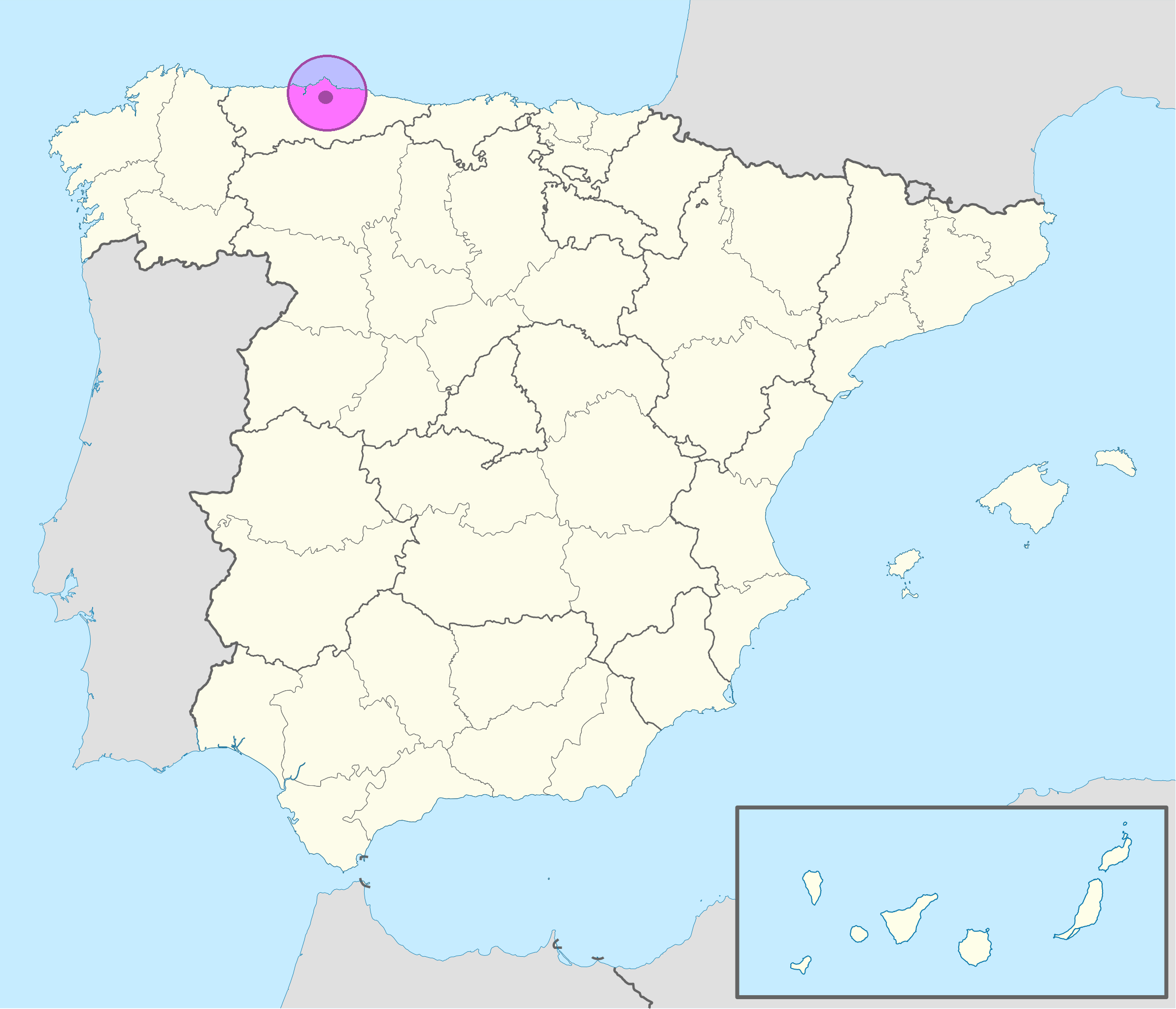 Oviedo (en violeta en los mapas de arriba y de abajo) se encuentra al norte de España, en el centro del Principado de Asturias, entre los ríos Nalón y Nora.