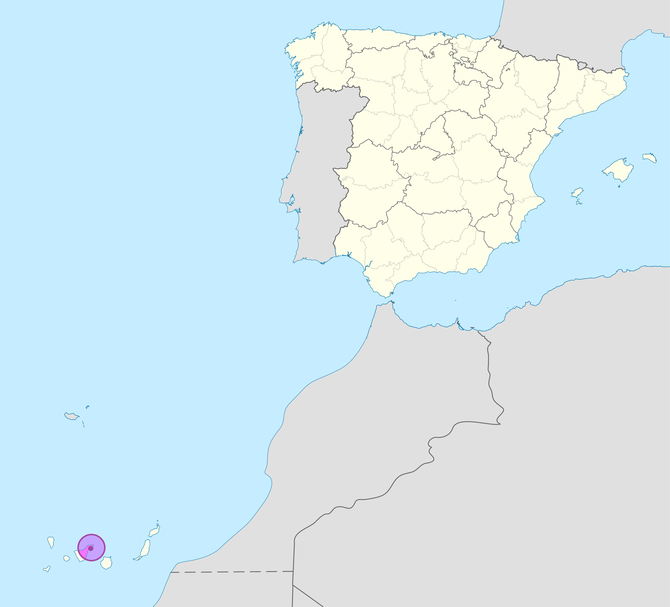 Santa Cruz de Tenerife se encuentra à 210 kilomètres au large de la côte nord-ouest de l’Afrique, dans l’océan Atlantique. Le point le plus proche de l’Espagne continentale est à 1 300 kilomètres.