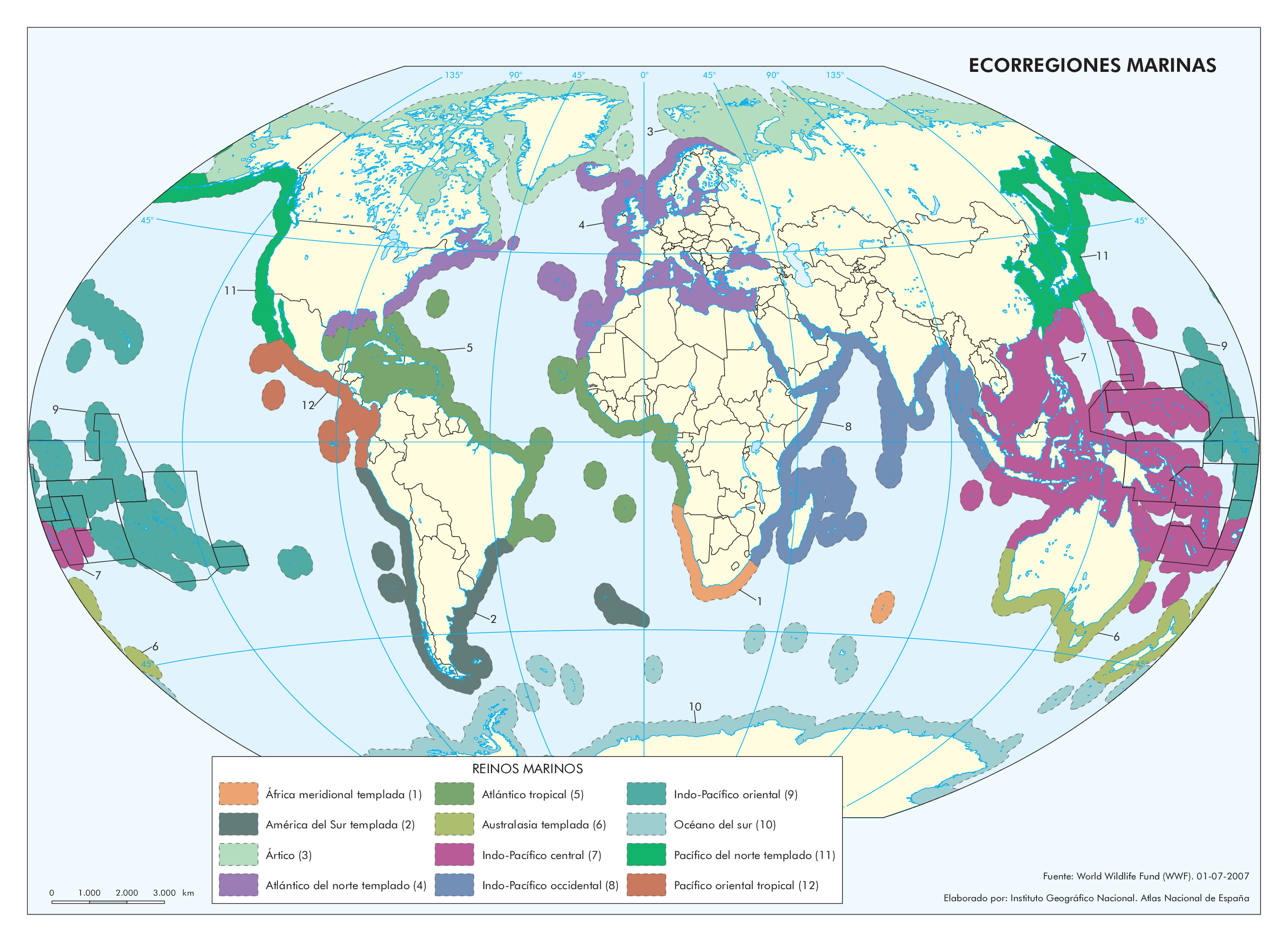 Están agrupadas en 12 regiones principales, que contienen más de 230 ecorregiones marinas, entre ellas: